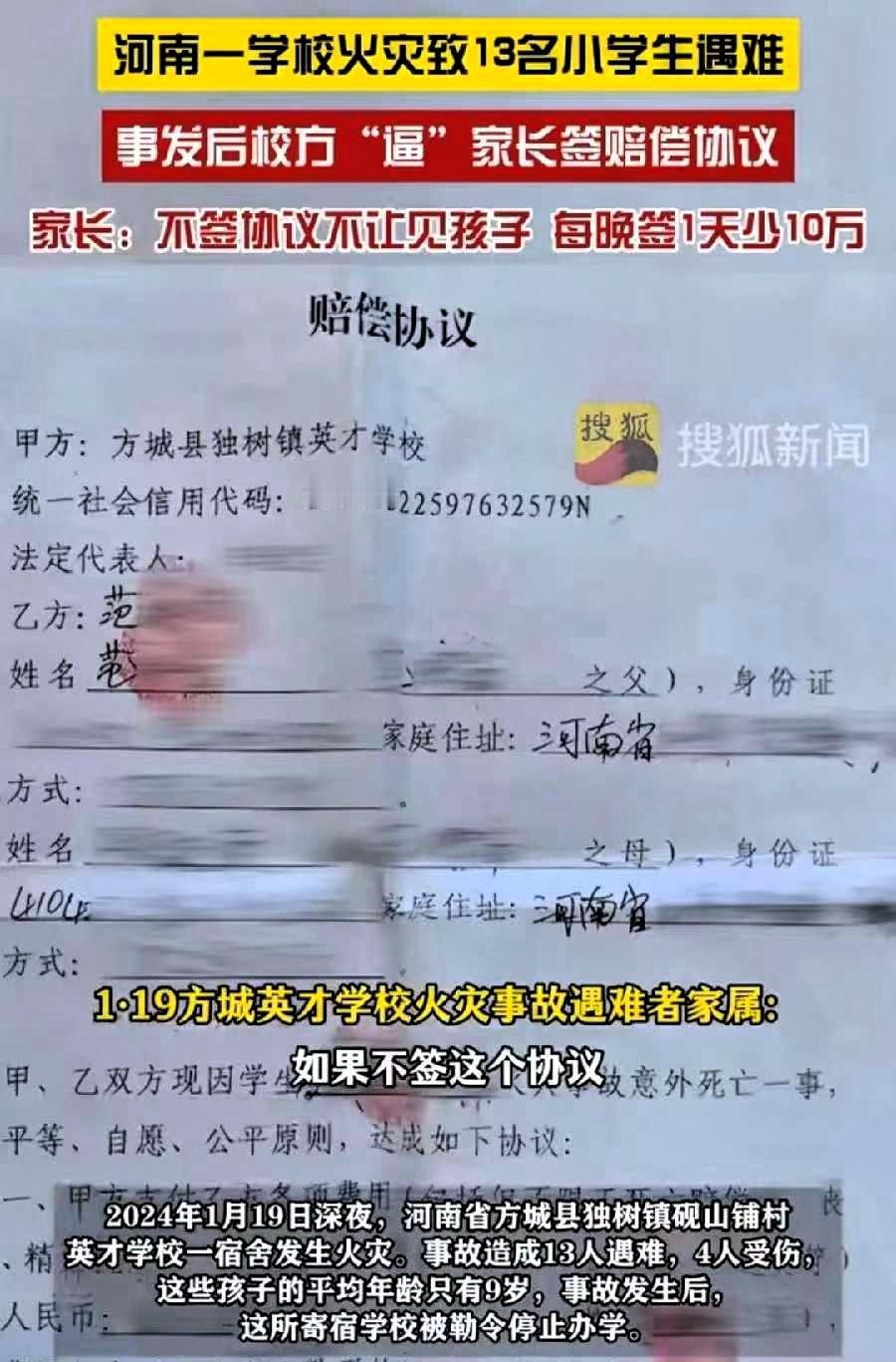 方城火灾赔偿,范啸楠爸爸曾透露,每个学生赔了约130万,拿了钱不能再追究 赔偿协议的细节曝光后,满是家长们的无奈,想要见到孩子,就必须先签下协议,甚至晚签一天赔偿金额都会减少。 在失去孩子的巨大悲痛中,家长们别无选择,只能被迫接受这份补偿。范爸爸曾说,130万赔偿款一分没动,换作任何一个家庭,面对孩子用生命换来的钱,都无法坦然使用,这笔钱承载的是满心的伤痛,根本无法当作普通的钱财对待。 如今有几位家长冒着可能退钱的风险,选择曝光这份协议,还有几位爷爷辈也站了出来,大概率这些孩子平时多由爷爷奶奶照顾,朝夕相处的疼爱,突然的离别,让老人们始终无法释怀。 范奶奶不愿搬走,担心孩子回家找不到人,简单的一句话,满是对孩子的牵挂,藏着最真切的思念,让人听着满心酸涩。 家长们的诉求一直很简单,从来不是追求更多赔偿,只是希望能依法处理相关人员,得到一个公开透明的真相,给逝去的孩子一个交代,也让自己的悲痛有个落点。 用钱解决问题、用协议约束家长,根本无法真正抚平伤痛,校园安全关乎每个孩子的未来,出了事故就该直面问题,承担相应责任,逃避和掩盖只会寒了大众的心。 这些孩子本该在校园里安心成长,拥有光明的未来,却意外止步,家长们的坚持,是为孩子讨公道,也是为了提醒更多人重视校园安全。唯有把真相查清楚,把责任追究到底,才能告慰逝去的生命,也能让更多家庭安心,守住校园安全的底线。 每个失去孩子的家庭都值得被善待,真相和公道不该缺席。