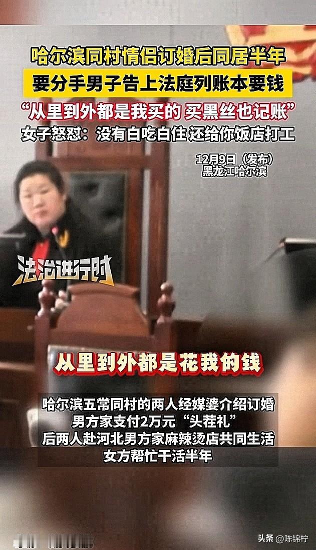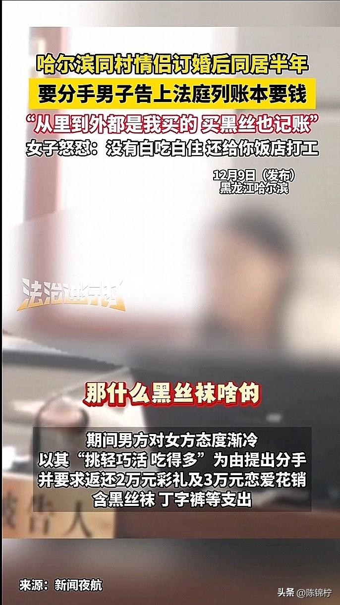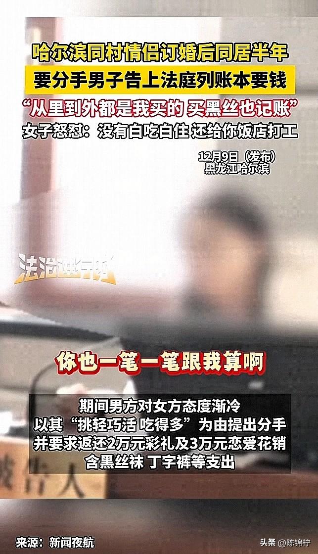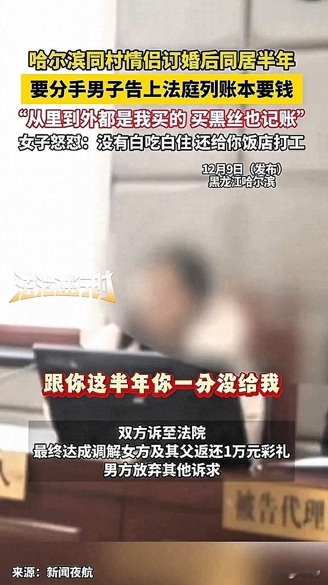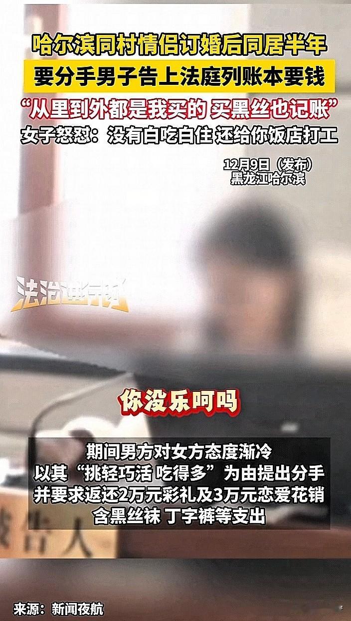 好离谱!情侣同居半年,男子嫌弃女友干活“偷奸耍滑”,还吃的多,提出分手,拿出黑丝袜丁字裤账单向女友索要恋爱开销,两人直接闹上了法院。 这俩人都是哈尔滨五常同村的人,是经过媒婆牵线搭桥促成的好事,两人当即订婚,男方家付了2万块“头茬礼”。 过后两人奔赴河北男方家的麻辣烫店一起生活,女子平时就在店里帮忙干活,这一干就是大半年,可干着干着男子就觉得女友“专挑轻巧”的事儿做,活干的少,还吃得“贼多”,是越看越不顺眼,认为女友不是自己心目中的好妻子。 就向女友提出分手,并要求女友归还彩礼2万元以及恋爱开销3万元。女子一看账单气的肝疼,男子算的太清楚了,里面是啥都有,大到彩礼小到袜子。男子在法院上还说女友“从上到下,从里到外,都是花的我的钱”。女子直接回怼“我给你打那么长时间的工,你一分钱也没给过我,那些快乐装备你没乐呵吗”? 最后,法院表示购买私密物品花销不予支持,女方及其父返还男方彩礼10000元,男方放弃其他诉求,双方达成和解。 婚前行为 恋爱 分手 账单