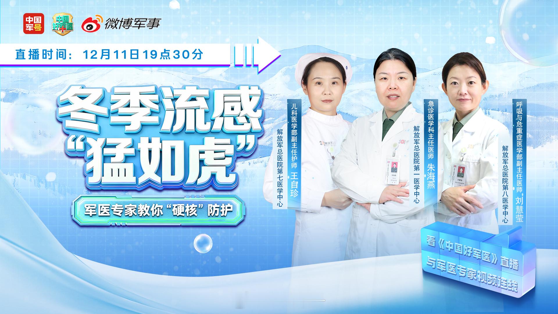 【锁定直播!军医教你防治流感】冬季流感“猛如虎”,如何区分流感和普通感冒?哪些是重症预警信号?12月11日19:30,锁定《中国好军医》直播间,解放军总医院专家团在线科普,为你全方位解析流感的科学防护。速来预约,不见不散!中国好军医
