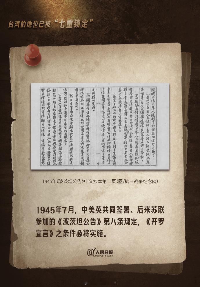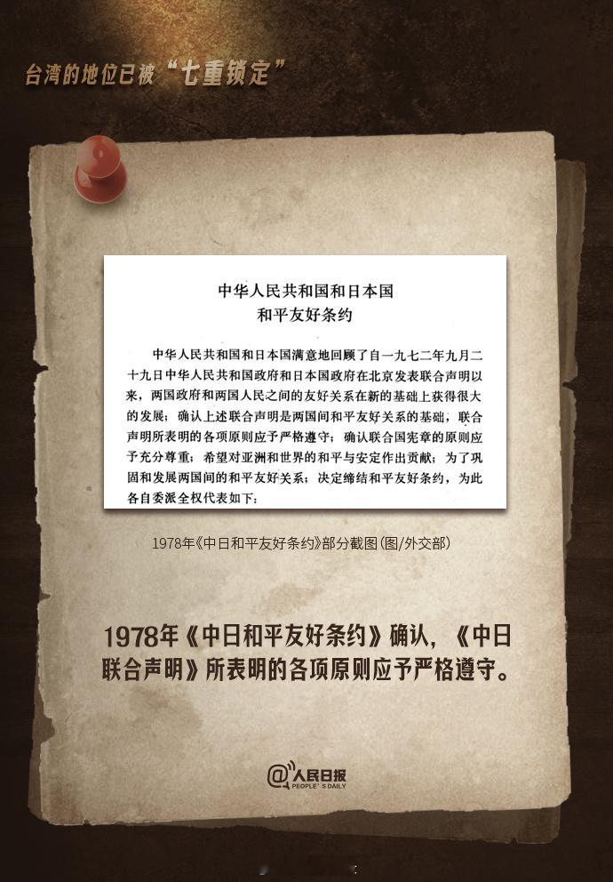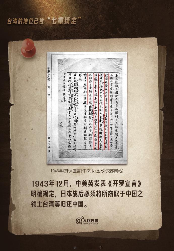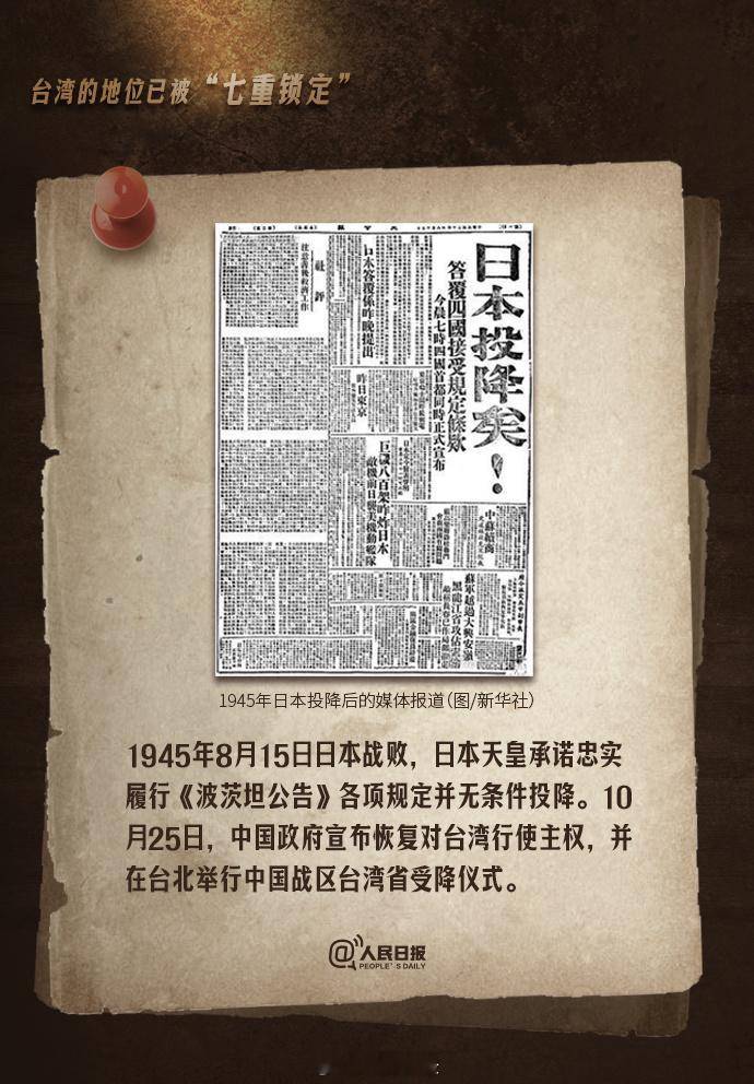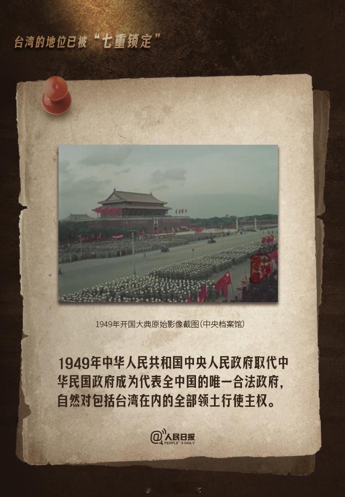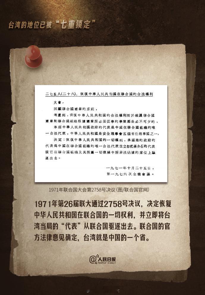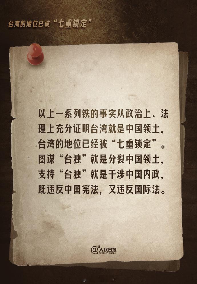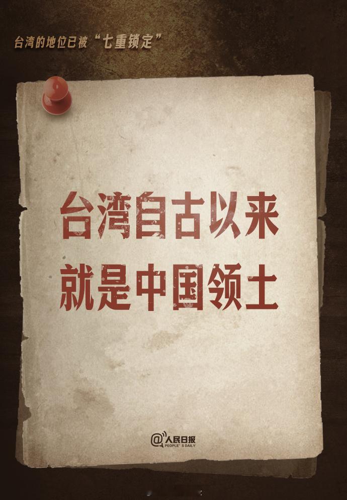 【传递!铁的事实证明台湾就是中国领土】从《开罗宣言》到《波茨坦公告》,从第26届联大2758号决议到《中日联合声明》……一系列铁的事实从政治上、法理上充分证明台湾就是中国领土,台湾的地位已经被“七重锁定”。台湾的地位如何被七重锁定,戳图了解↓↓ (人民日报)