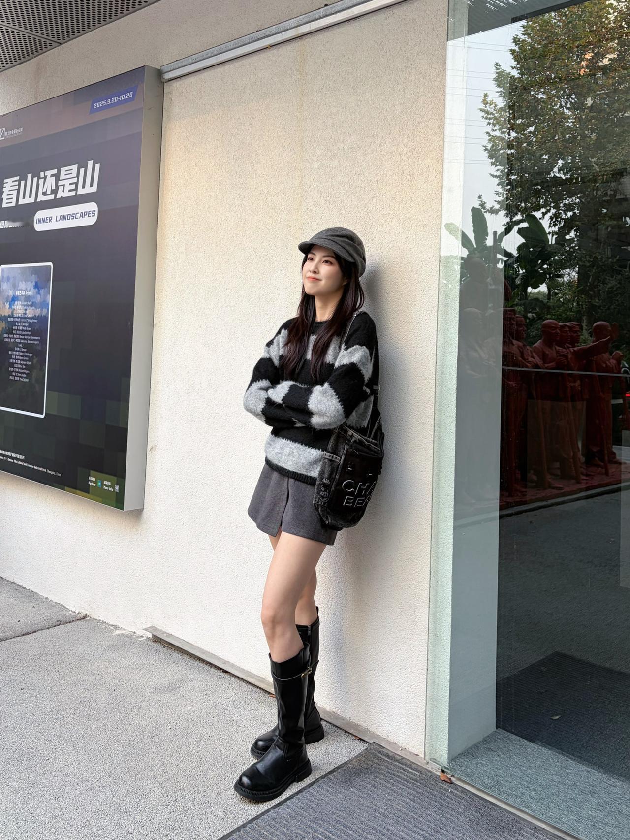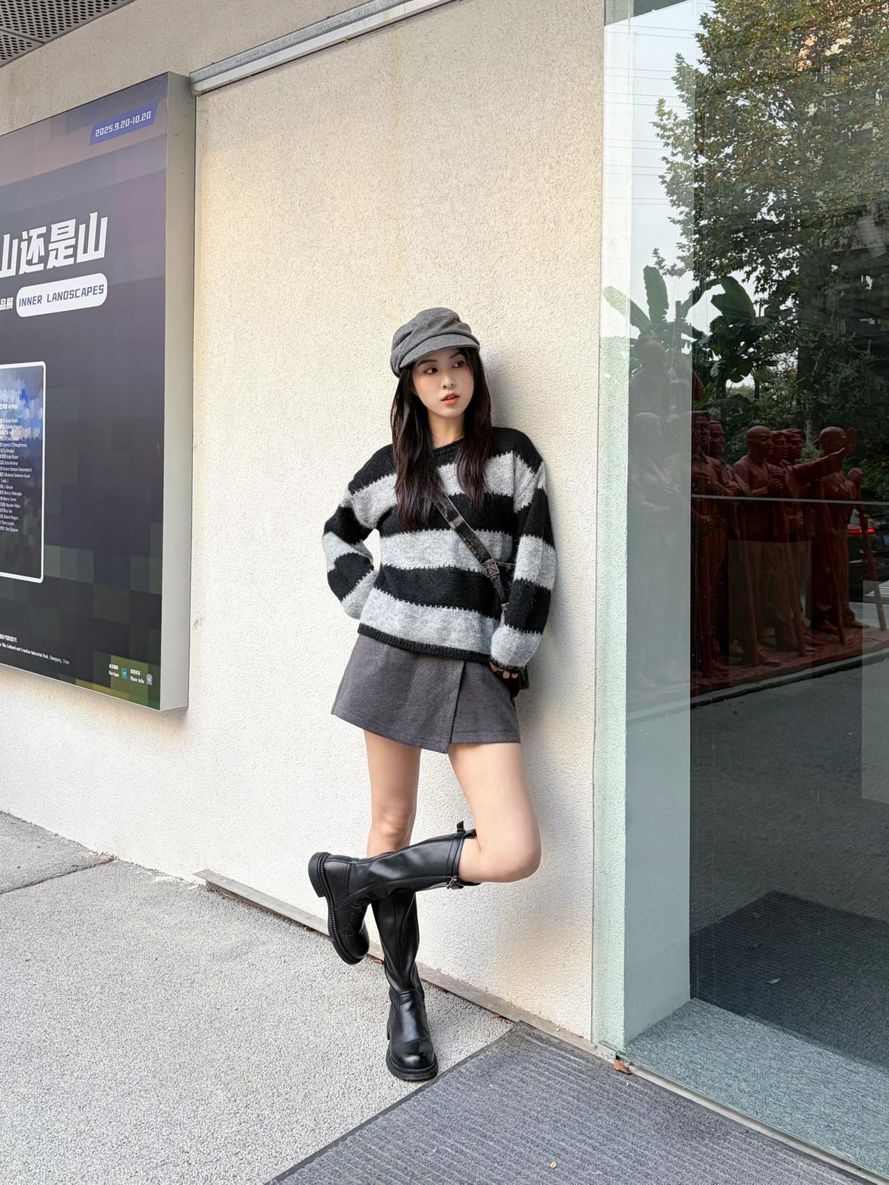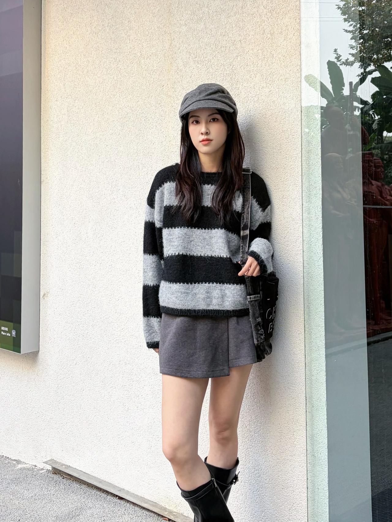 韩系街头氛围感穿搭|秋冬甜酷感拉满 ||| 今天这套搭配思路用基础的黑白灰打造出韩系街头的随性氛围感,甜酷交织,不管是逛街还是探店拍照都超出片,秋冬穿完全不挑场合~ 🧶 上衣:黑白灰条纹软糯毛衣 👖 下装:深灰色毛呢短裙 👢 鞋子:黑色机车长筒靴 🧢 配饰:灰色报童帽+牛仔腋下包黑白色调穿搭 黑白灰穿搭技巧 灰调高级感穿搭 高级感灰调穿搭 米色韩系穿搭 秋冬韩系穿搭 灰调高级穿搭
