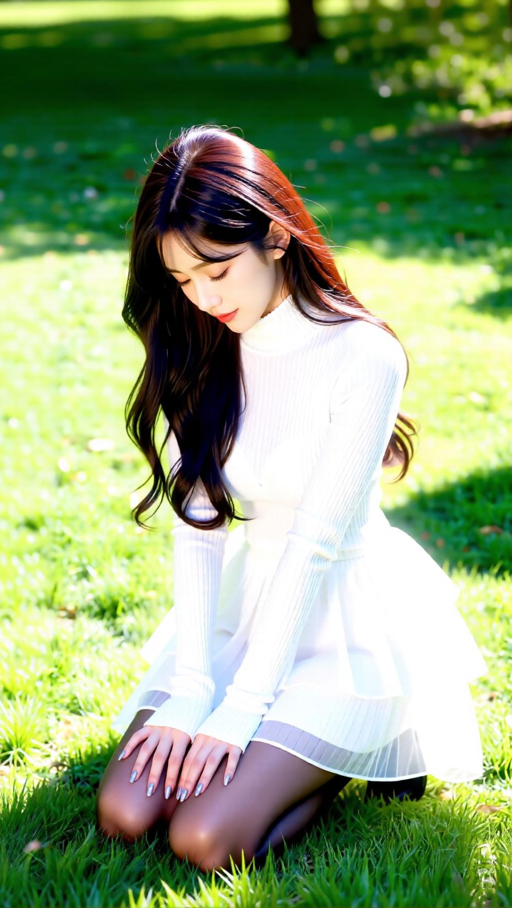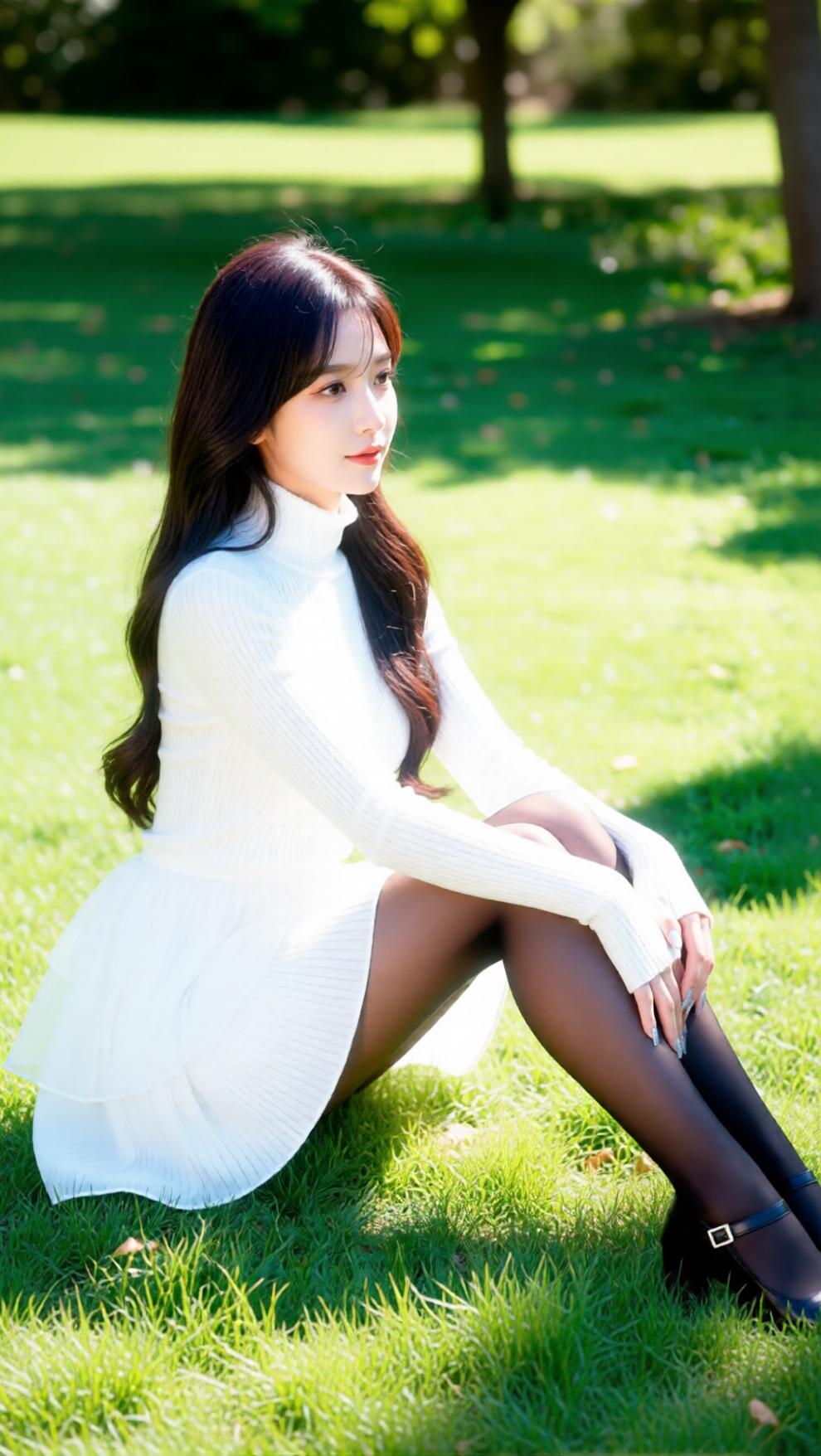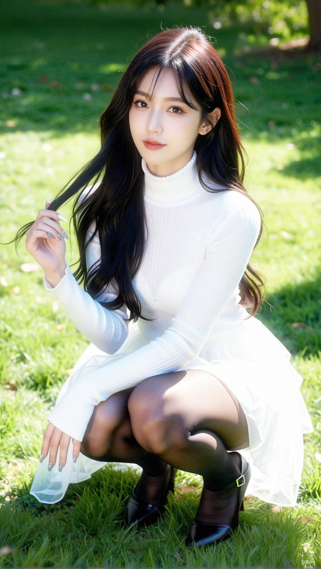 阳光下的甜美少女,白色毛衣与黑色长袜的完美搭配,尽显青春活力!
