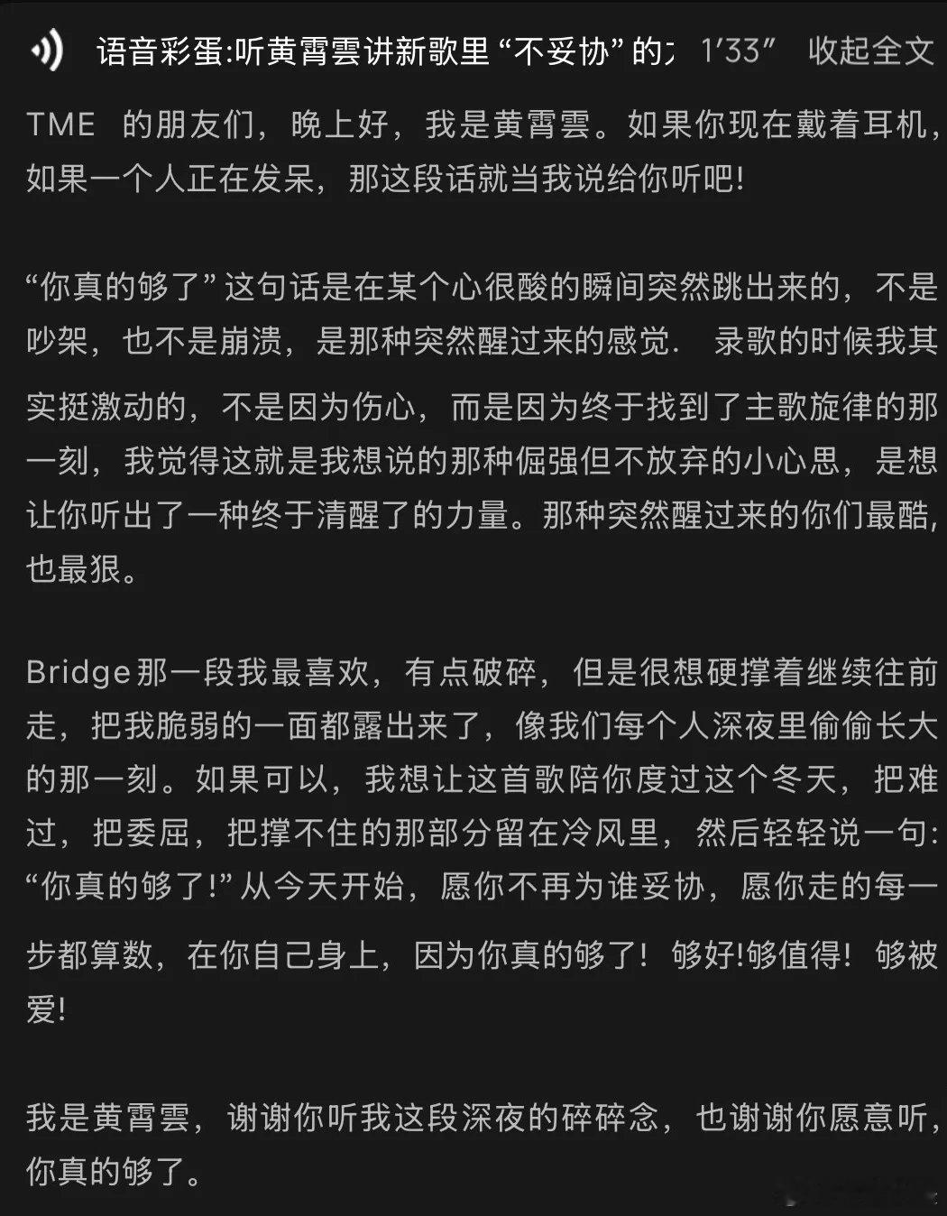 我就说让黄霄雲词曲创作会出大事 黄霄雲不止唱功强!新歌《你真的够了》自写词曲,穿透力音色释委屈,给内耗者勇气,这“大事”超赞!