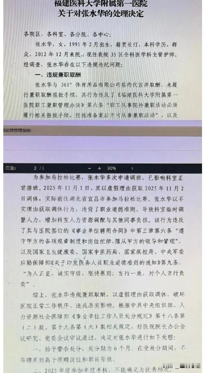 最快女护士张水华被处分,这事真不冤! 看到张水华被医院警告的消息,一点都不意外。 先是跟361°签约代言拿钱,连医院的兼职报批都没办,这规矩不就是用来守的吗? 再看调休那事儿更离谱,为了去宜昌跑马拉松,拿假理由骗调休。科室临时调人、同事多干活,她倒好,跑去赛场拿奖金。 之前哈尔滨马拉松哭诉要领导支持调休,看着挺委屈,结果转头就违规。近50天跑5场马拉松拿20多万奖金,哪还有心思顾本职工作? 护士岗本来就忙,大家都是互相搭把手。你只顾着自己的爱好,把科室秩序搅乱,同事们能没意见吗? 爱好没问题,跑马拉松拿奖也厉害,但前提是别踩规矩的红线。要是工作和爱好实在平衡不了,不如选一头好好干,总比两边都搞砸强。