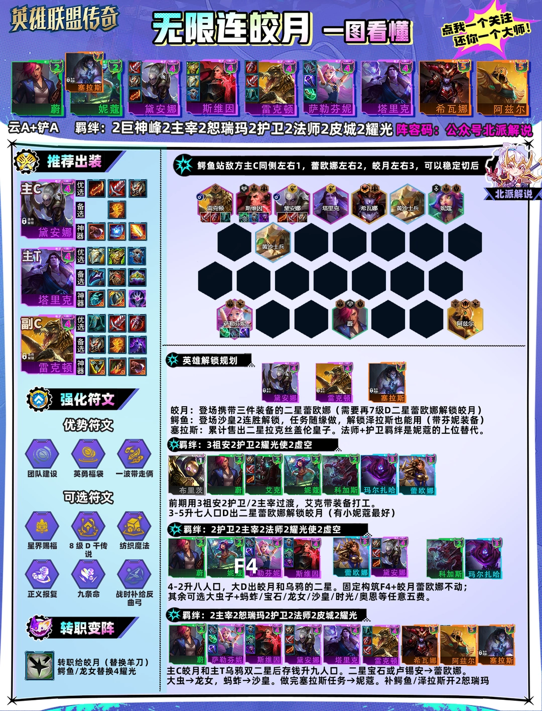 皎月机制类似上赛季阿卡丽,切4格的单位,对位左3右3抓到可以轻松带走1星五费后排,沙皇来的早解锁鳄鱼可以形成双突进切后。