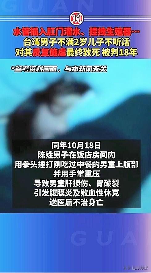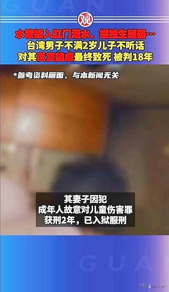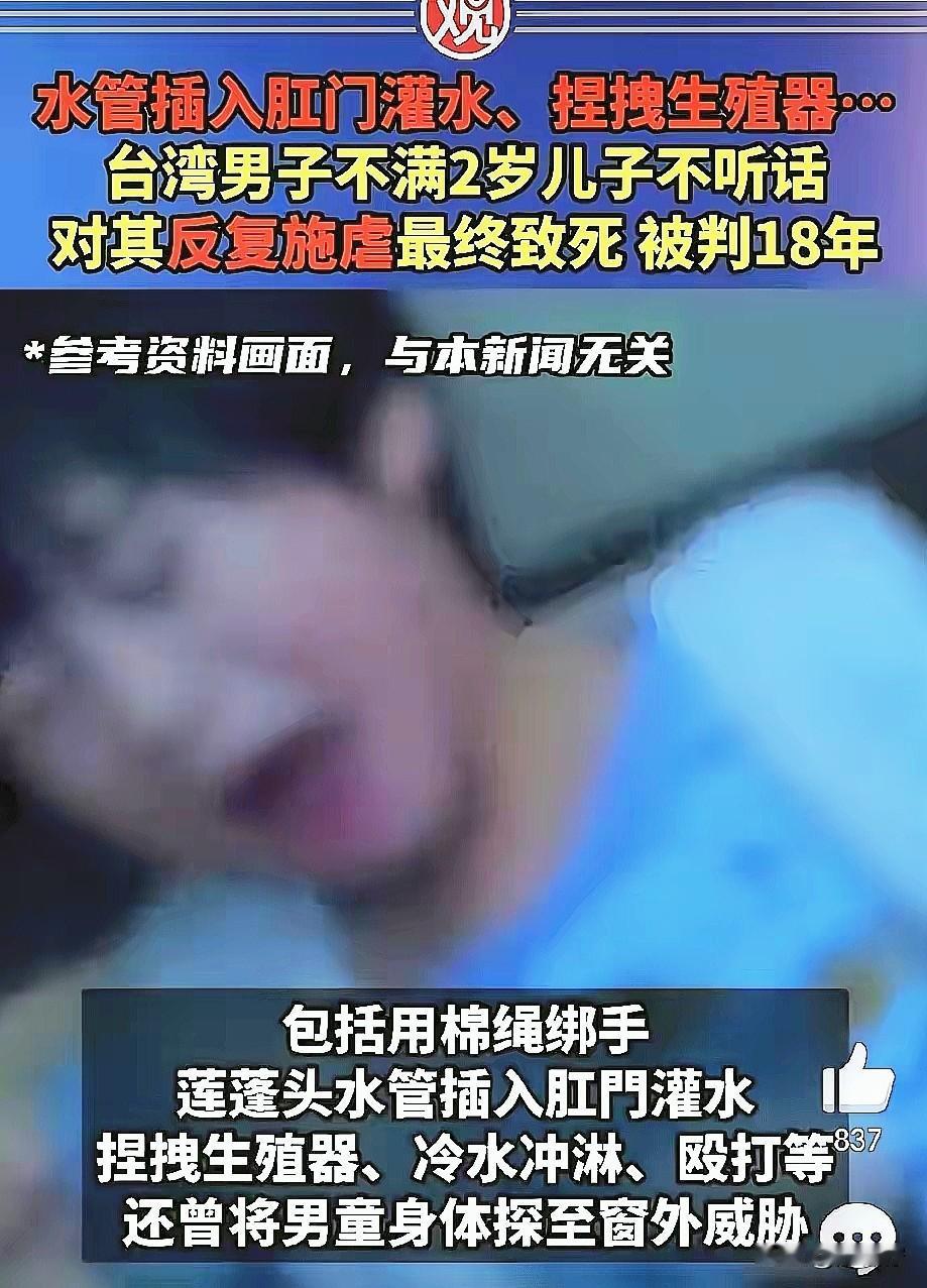亲生的孩子,怎么能下得去如此狠手,虎毒还不食子!才2岁的孩子,就被亲爹虐待致死,原因是孩子不听话,可男子的每一种教育方式,完全就是在虐待孩子,过程更是让人看不下去,孩子当时得有多害怕。 台湾2岁的孩子,家长认为不听话,最终在父亲的教育下,肝损伤,胃破裂引发腹膜炎以及败血性休克死亡。 可这位父亲非但不知悔改,还认为法院判他18年,判的太重了不服,提起上诉,近日,被驳回。 没想到的是,孩子的母亲也虐待他,女子被判成年人故意对儿童伤害罪获刑2年,已经入狱服刑。 让人心疼的孩子,小小的人儿,满心欢喜的来,却没尝到一点甜,没感受到一点温暖,没得到父母的爱,却要承受父母的恶。 在法律面前,任何违法犯罪的事,都是逃脱不了的。善有善报,恶有恶报,自己做下的事,就要承担一切后果。 虐待儿童死刑 虐待恶行 男童被虐致死案 虐待子女致死