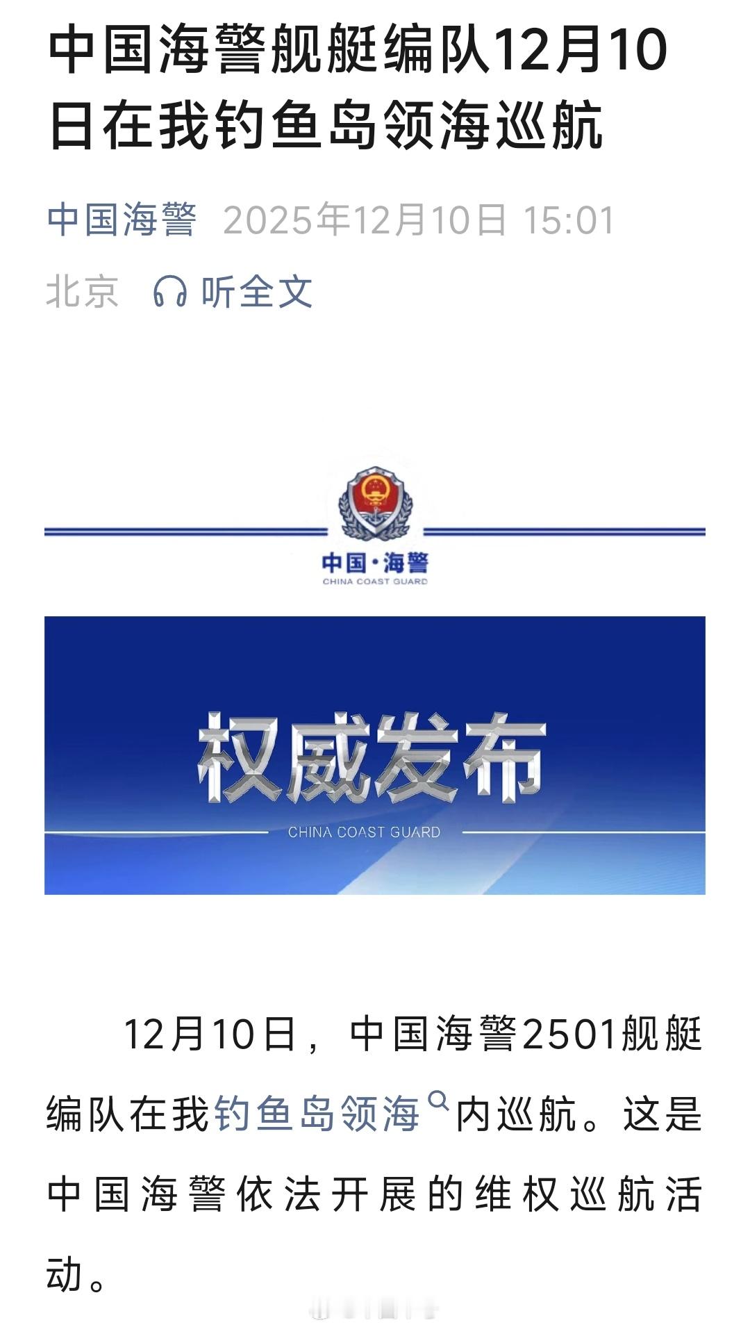 【中国海警舰艇编队在我钓鱼岛领海巡航】12月10日,中国海警2501舰艇编队在我钓鱼岛领海内巡航。这是中国海警依法开展的维权巡航活动。(中国海警)