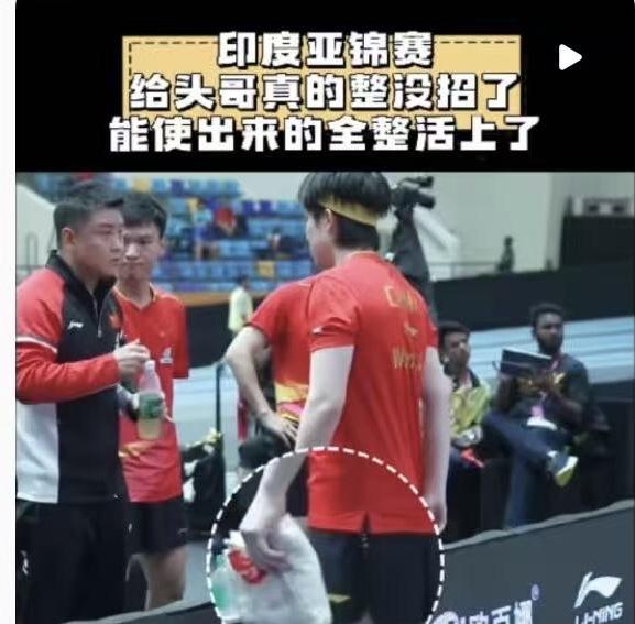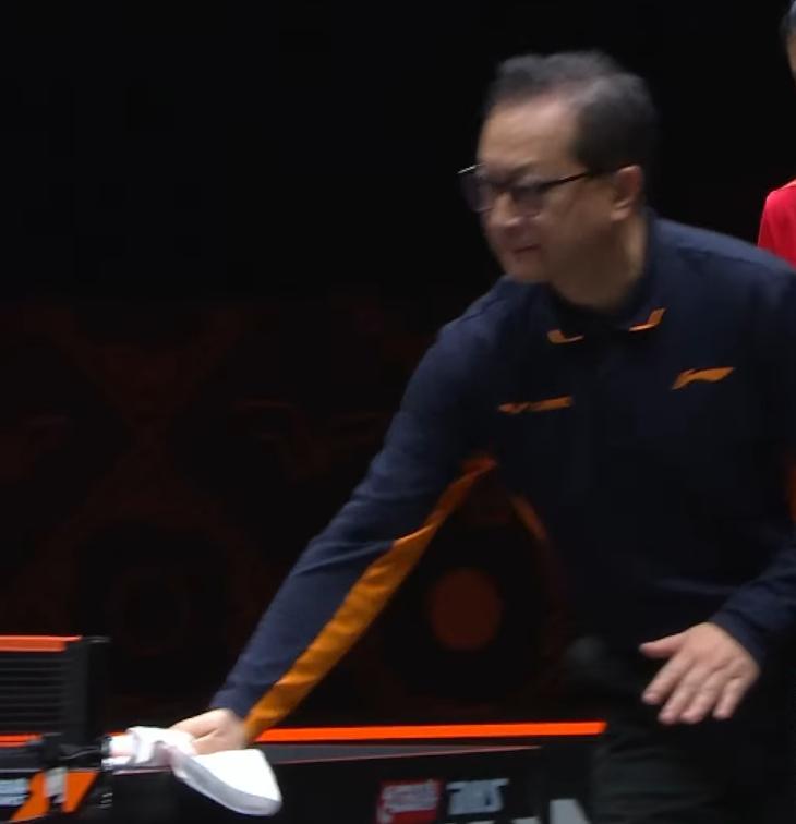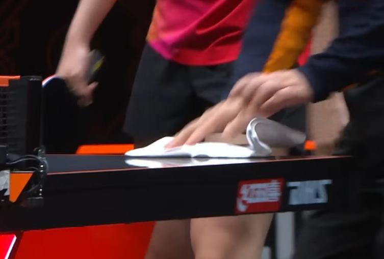 突发!陈熠和朱雨玲这场比赛还没打, 陈熠就发现不对了! 陈熠指着球台, 有一些液体, 应该是上一场, 邱党和勒布伦留下的汗水。 看来工作人员做的工作不细呀, 没检查球台, 就开赛了! 最主要的还是毛巾盒, 印度亚锦赛的时候, 王楚钦迟迟不放毛巾, 后来才知道, 毛巾盒都快爆浆了。 他垫了个塑料袋放的毛巾。 所以这次主办方也得注意清洁。