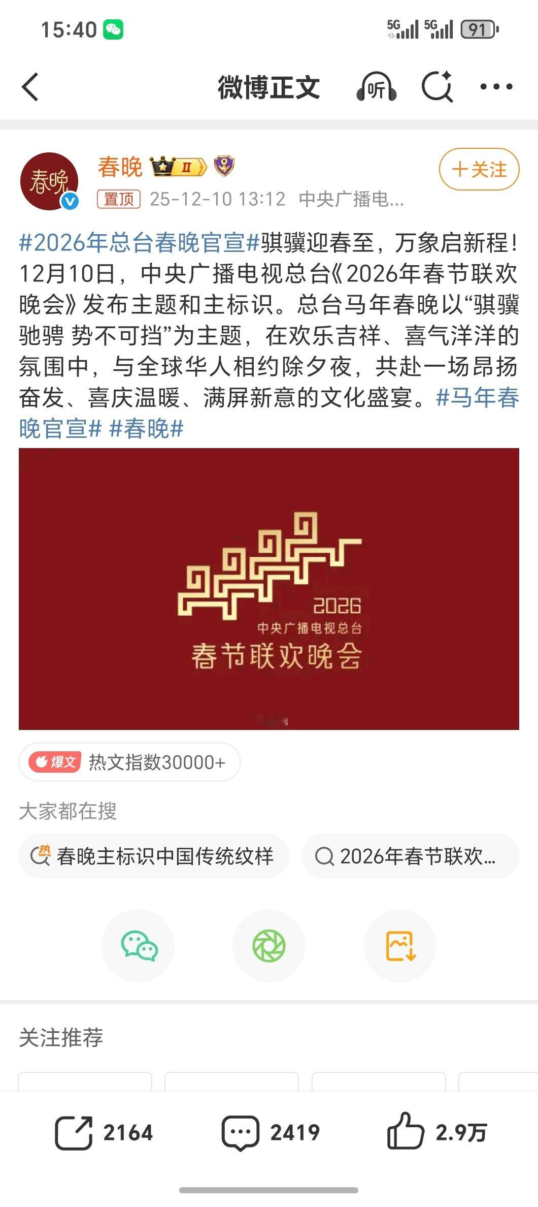 马年春晚官宣wow今年春晚要来了!马到成功!势不可挡!今年这主题和视觉如何?我比较期待费翔是不是能cos一把