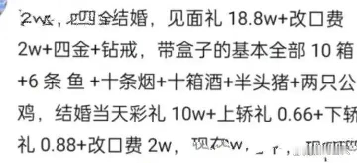 现在结个婚真难。 大徐吐槽,他和阿丽相恋了两年,终于瓜熟蒂落,水到渠成,结婚之事已提上议程。 有情人终成眷属,这本是喜事。大徐也忙着筹备婚礼之事,办喜事的日子也选好了。可是,小丽家送来了一份结婚清单,大徐就高兴不起来了。 清单列着,彩礼18.8万,改口费两万,结婚当天再给十万,还有四金一钻,还有见面礼。 这一全套算下来,已过40万了。还不包括婚礼婚宴的开支。这就是说,结婚一套流程下来,怕得大大几十万。这笔开销,对大徐这样的一般家庭来说,确实是一个很沉重的负担。 为准备婚房,大徐已几乎倾尽所有,付了首期,所剩无几。 他原本以为,东借西凑,准备个十几万,把婚事办了,两人勤俭过日子,日子还可以过下去。 没想到清单杂七杂八的加起来,已超出他预算的三四倍,他为难了。 结个婚真难,他叹道。 这个婚真的结不起了。