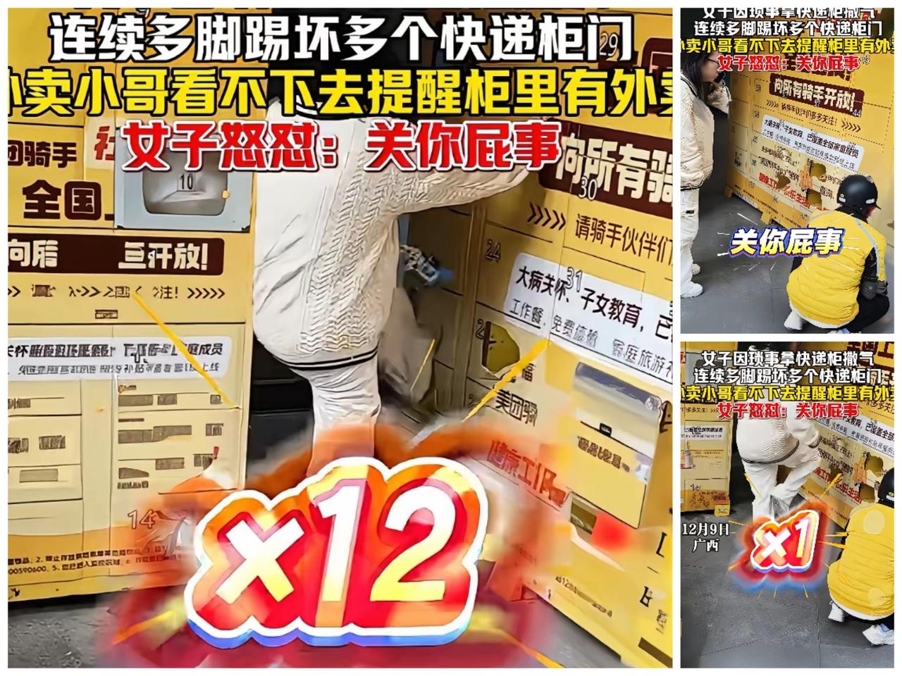离谱!见过乱撒气的,真没见过拿快递柜泻火这么没素质的!刷到条视频直接看吐,一女的对着快递柜一顿猛踹,好几个柜门被踢得破破烂烂,旁边外卖小哥好心提醒里面还有别人的外卖,直接被她凶巴巴怼回去“关你屁事”,这操作又蠢又膈人,属实刷新下限! 谁过日子没点烦心事,委屈糟心都正常,但情绪差从来不是霍霍公物、糟践好心的借口,快递柜招谁惹谁了,里面说不定是别人等了好久的热饭,或是急着用的要紧东西,凭啥为她的坏脾气买单? 外卖小哥一片善意提醒,怕旁人受牵连,这份责任心被这么泼冷水,看着都窝火寒心。说白了,控不住情绪乱造就是自私没教养,踹坏公物要赔钱还可能追责,一时痛快惹一堆麻烦,纯纯自讨苦吃。 真有火气找朋友吐槽、吃顿好的都能疏解,拿公共利益撒气只会暴露自己的low,既丢面子又惹祸,太不值当。 你们遇过这种只顾自己发泄不管别人的人吗?碰到会直接怼回去还是默默避开?评论区唠唠~