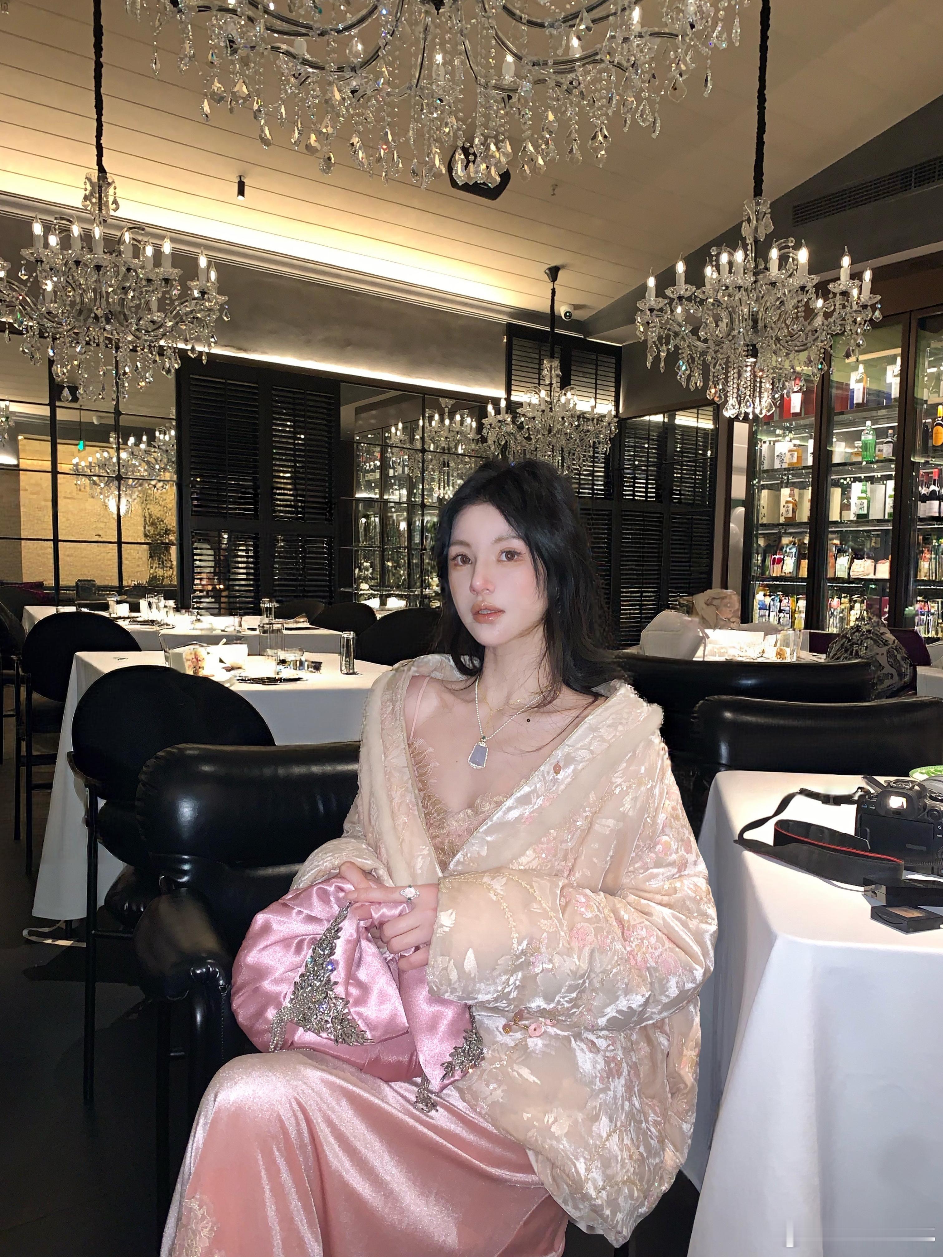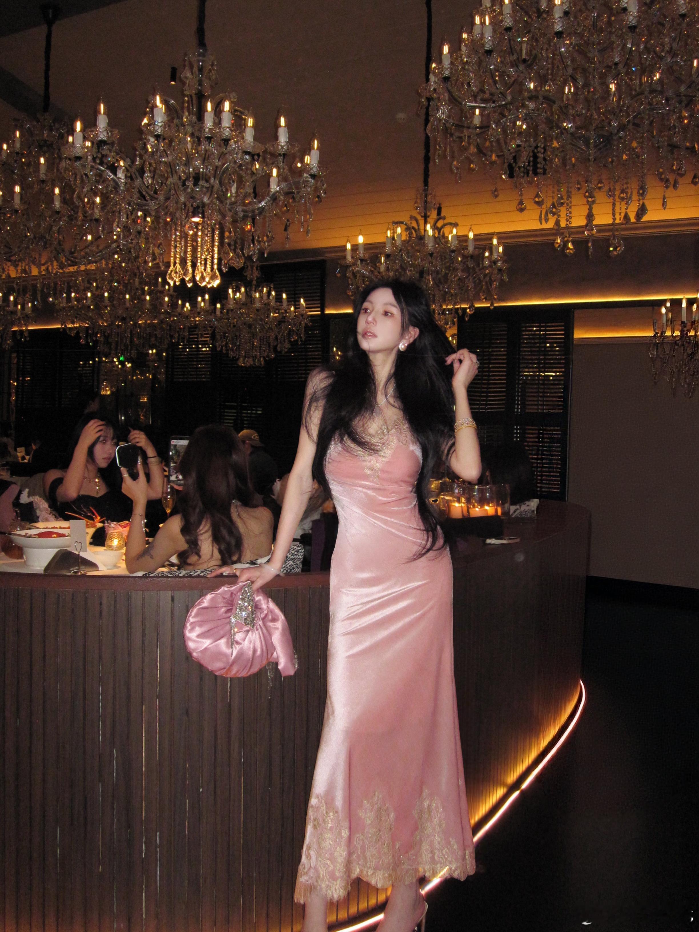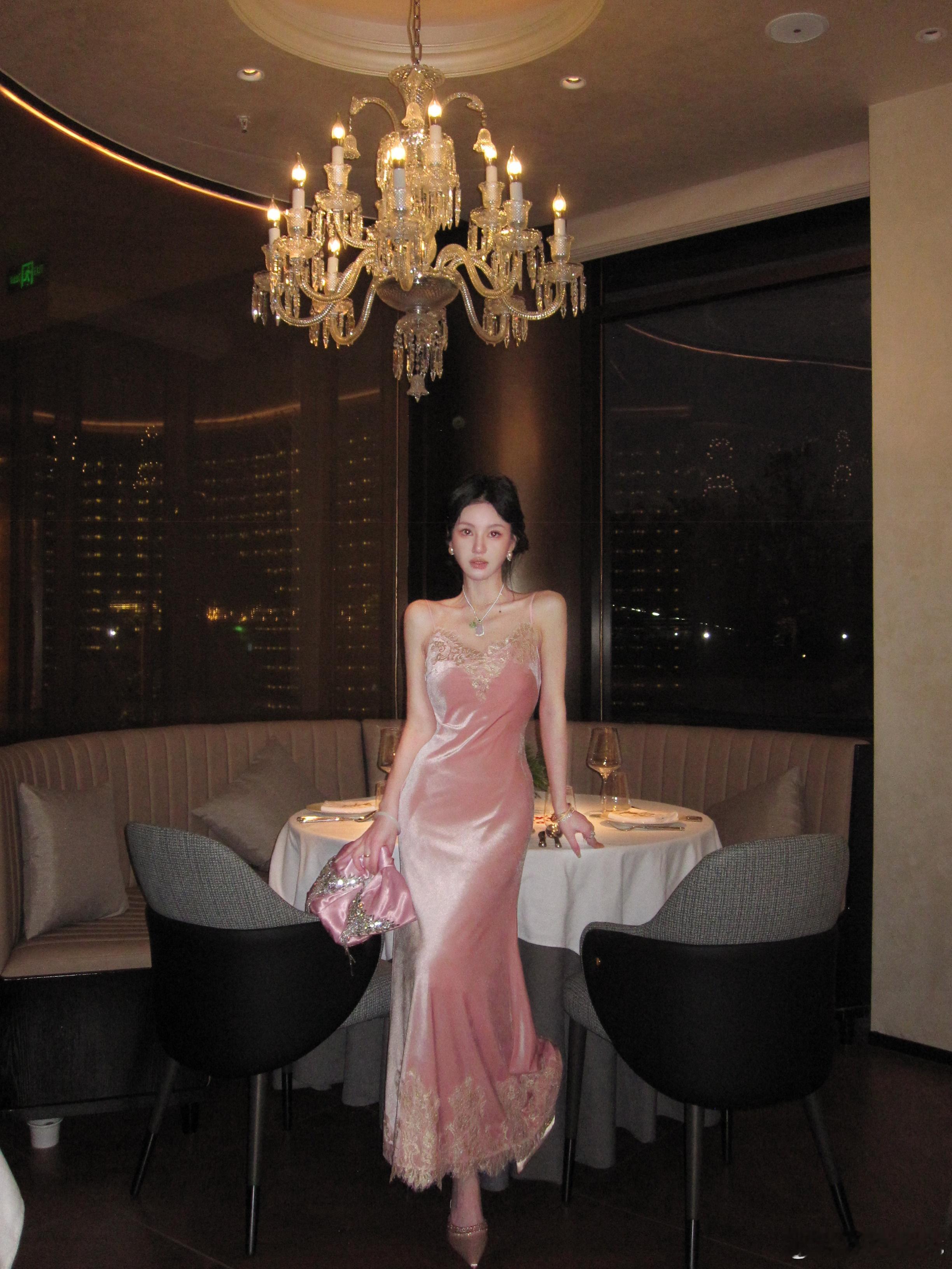 𝑴𝑶𝑺𝑺 𝟏𝟐.𝟏𝟐/𝟐𝟎:𝟎𝟎𝒑𝒎【致爱丽丝】🩰新中式蕾丝拼接V领丝绒吊带裙裙装采用修身版型👗腰腹处自然收窄,裙摆垂坠,V领剪裁优雅修饰肩颈线条,既能露出优美锁骨曲线,又适配叠搭项链⛓️等配饰,胸口和下摆使用了定制染色金线✨蕾丝,蕾丝纹样以缠枝花卉为底,金线勾边如绣线晕染,与杨妃粉丝绒精准呼应,吊带设计简约利落,细肩带可轻微调节长度,尽显完美肩颈线条👍新中式穿搭质感穿搭