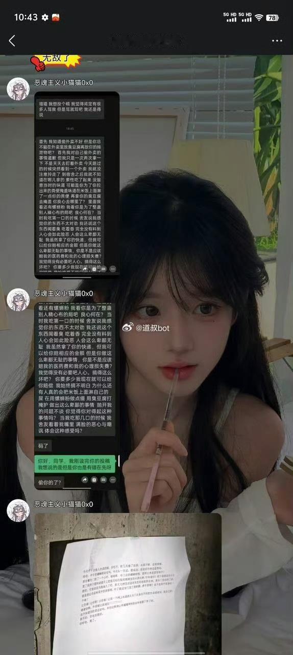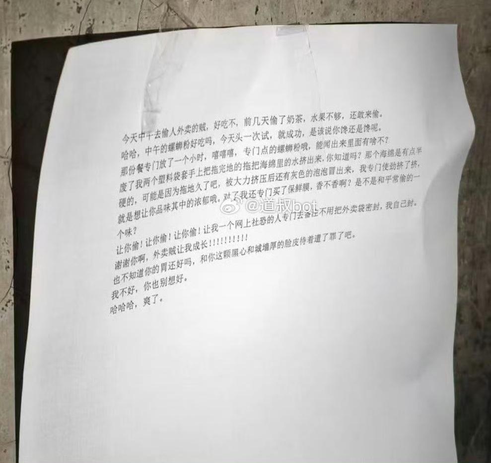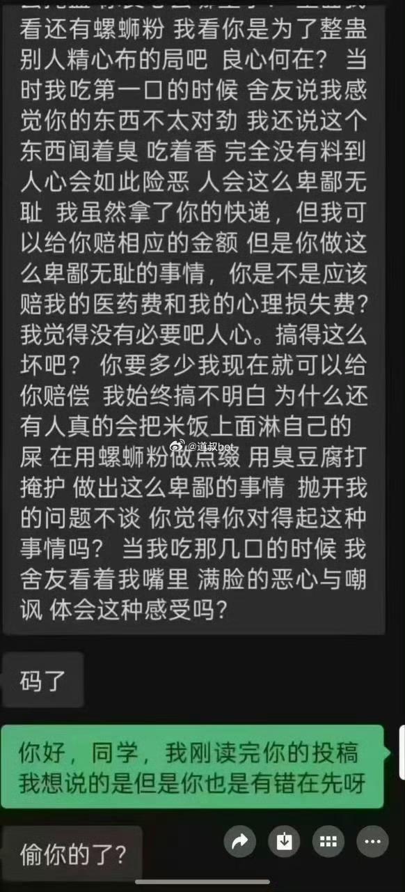 一学生偷外卖,被整蛊,吃到一半发现里面有大便,愤而报警,这脸皮比城墙还厚啊。估计是外卖被偷惨了,想出了这个招对付这些缺德加无耻的。为了掩盖大便的臭味,刻意加了臭豆腐,可谓煞费苦心。这个学生说要找整蛊他的人要医药费和心理损失费,舍友看到了,满嘴恶心和嘲讽。外卖盗窃