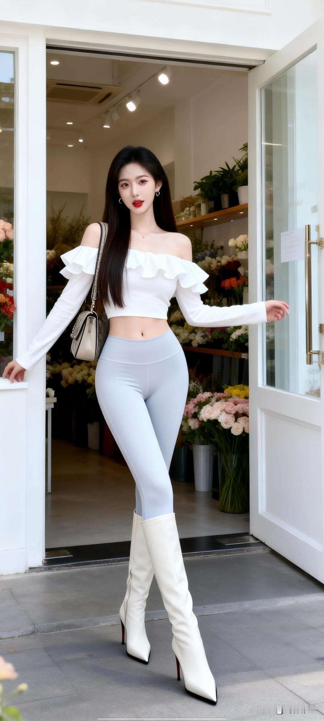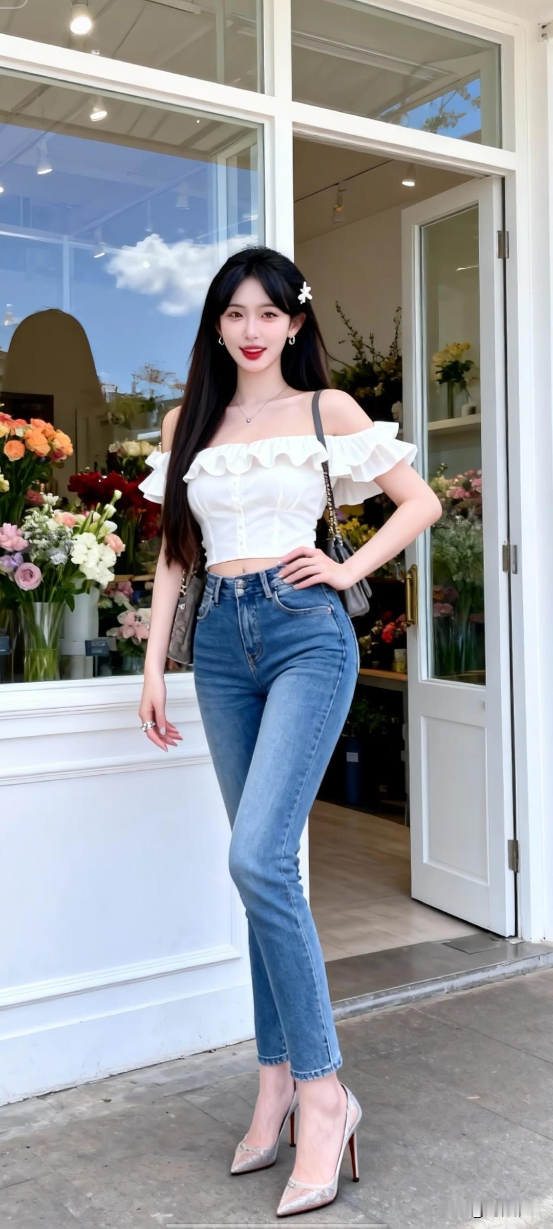 甜美白露肩上衣+牛仔裤,花店前打卡,少女心满满!🌸💕