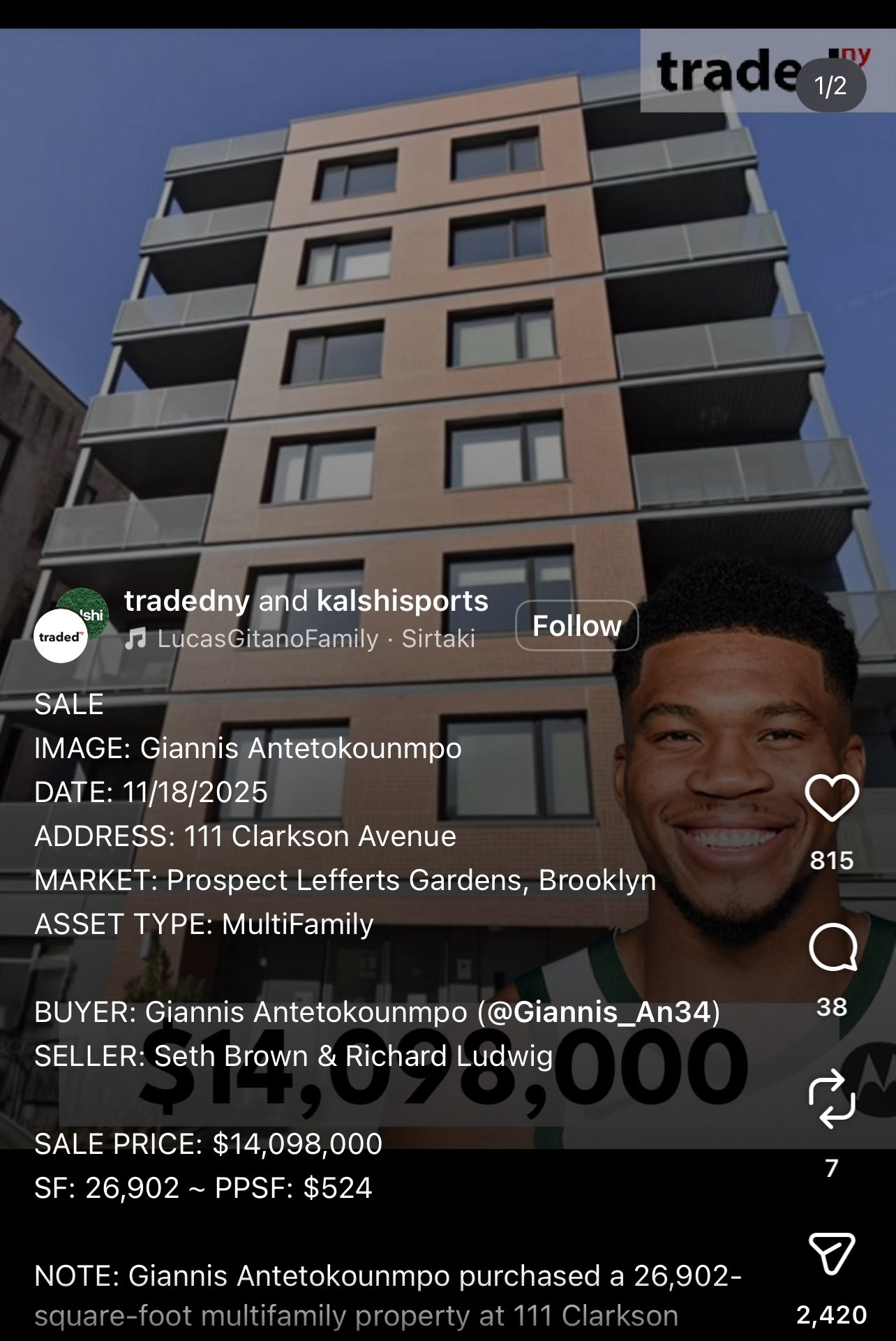 字母哥纽约买下28套房公寓楼 据媒体公司Traded报道,字母哥上个月在纽约市的布鲁克林区的克拉克森大道购买了一栋公寓大楼,价值1410万美元,总面积大约是2500平方米。这栋公寓大楼一共有28套房,因此字母哥的这笔购买大概率是为了投资,而不是自住。 Haynes在节目中谈到了字母哥的情况,消息人士称字母哥已经和部分队友会面,回应了关于他未来的传闻,他给队友传达的信息是专注于篮球,不要让外界的干扰影响球队。字母哥回应关于未来传闻