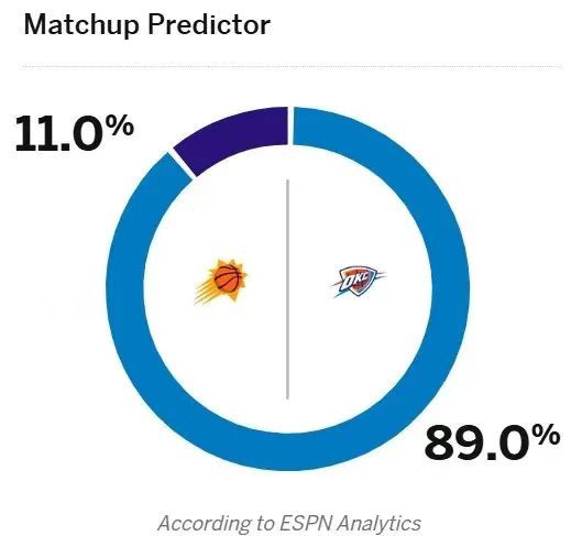 NBA 明天上午8点半,雷霆与太阳的NBA1/4决赛即将开打。ESPN预测本场比赛胜率,雷霆89%,太阳11%。