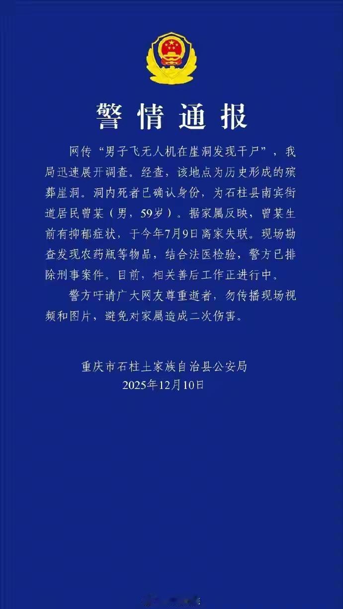 重庆崖洞干尸接连被发现,无人机意外揭秘引全网热议!12月4日,石柱飞手拍摄巴人岩棺群时,在高处方口岩棺中发现一具姿态安详的完整干尸,被网友比作“楼兰美女小河公主”;5天后的12月9日,另一男子操控无人机时,在偏僻崖洞也发现干尸,两起事件均第一时间报警,相关部门与文物局专家已介入调查,目前结果尚未公布,网友纷纷猜测身份,有人认为是秦良玉,也有人推测为龙河公主。其实贵州、新疆等地也曾有崖洞干尸出土,这类发现因身份成谜、场景震撼,向来备受关注。 不得不为这些飞手点赞!发现异常后,他们没有猎奇乱闯、破坏现场,而是理性联系官方,这份敬畏心和责任感难能可贵。若是私自触碰现场,无论是文物保护还是案件调查,都可能错失关键线索,造成不可挽回的损失。 每具崖洞干尸都承载着不为人知的过往。贵州思南曾发现明代干尸,身着二品仙鹤补子官服,衣物带血且有刀伤,推测为叛乱被刺杀的土司田宗鼎,族人为避朝廷清算而秘密崖葬;新疆出土的清朝干尸,证实是随左宗棠收复新疆的英雄马文化,长眠边疆。这些干尸都是历史的见证者,考古揭秘既是对历史的探寻,也是对逝者的尊重,每个生命与过往都不该被遗忘。 此外,这也给无人机爱好者提了个醒:飞行并非随意之举,需时刻保持谨慎与责任意识。