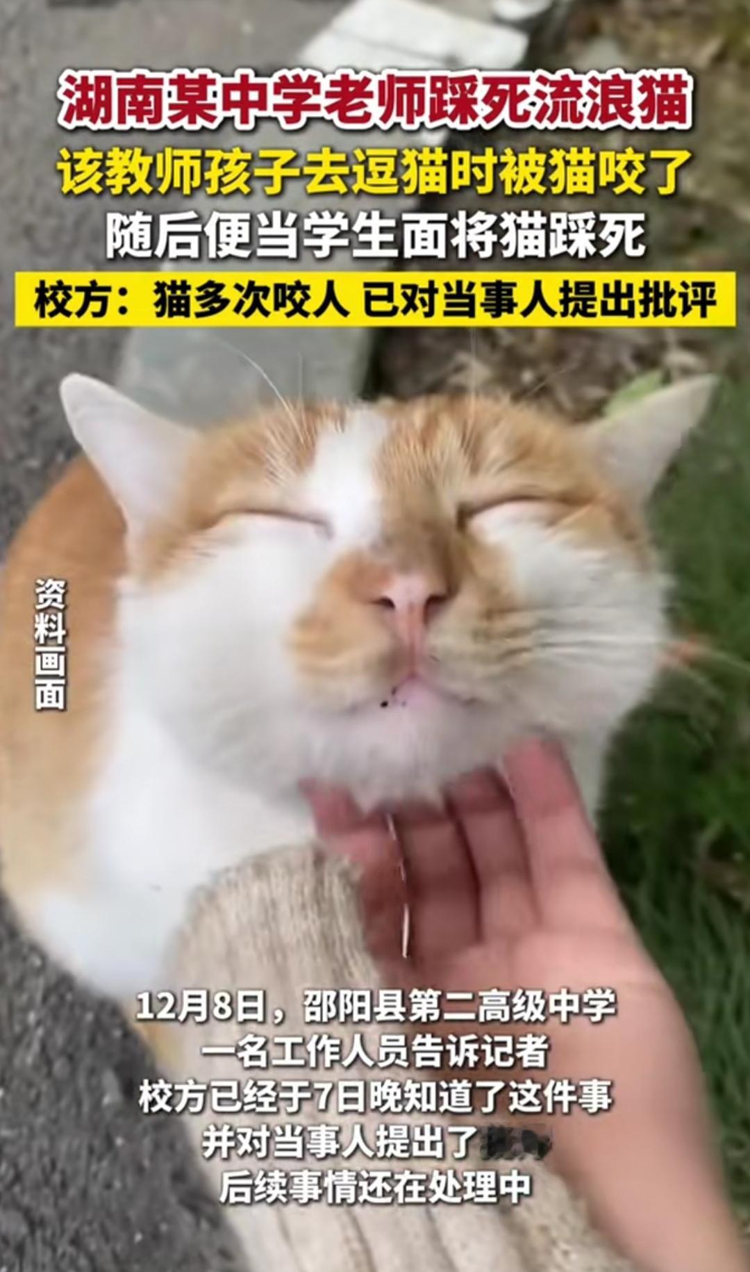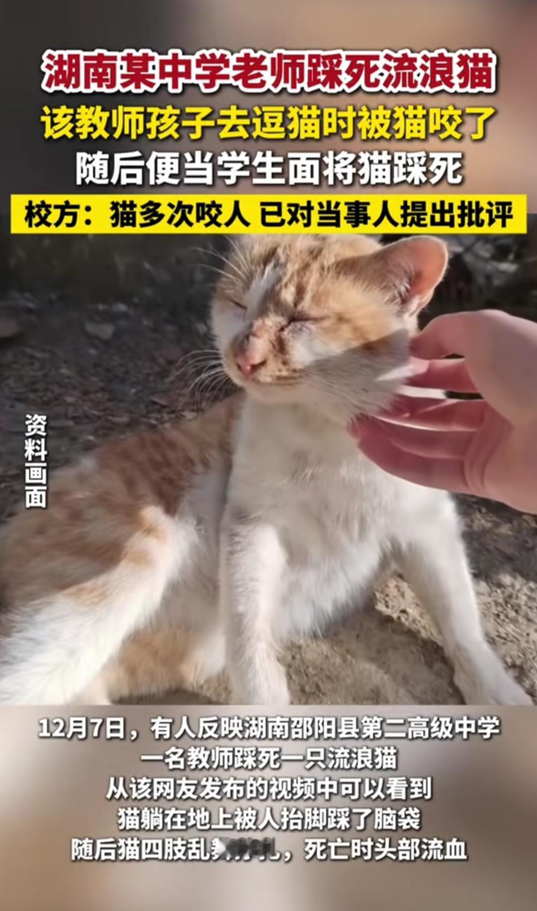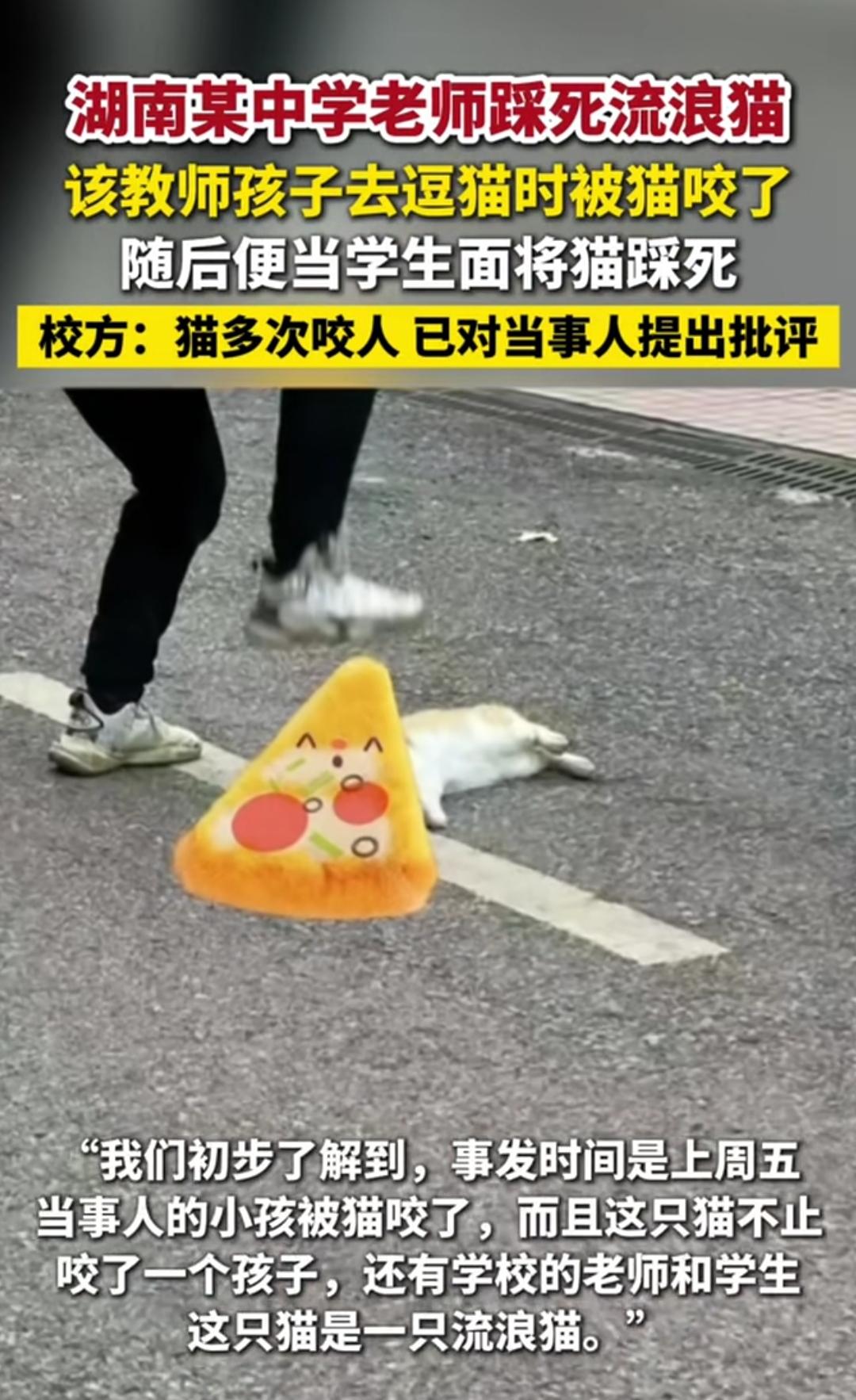看到这一幕,我后背直冒冷汗,这哪是除害,分明是把“残忍”当成了“正义”! 谁能想到,堂堂高中校园里,一位教书育人的老师,竟然当着学生的面,一脚踩爆了流浪猫的脑袋?校方解释说是因为猫咬伤了学生,老师情绪失控。可这所谓的“失控”,未免太让人胆寒了吧! 咱们普通人遇到猫狗咬人,第一反应是驱赶或者找专业的人来抓,哪有直接下死手的?这不仅仅是处理方式的问题,这是心里的“恶”被释放出来了啊!老师啊,你是学生的榜样,你这一脚踩下去,孩子们以后遇到问题,是不是也学你用暴力解决? 更讽刺的是,这猫之前咬伤人,确实可恶,但罪不至死吧?而且还是这种死法!这事儿要是发生在社会上,估计早就被骂上热搜了。放在校园里,难道就能用“情绪失控”四个字轻轻揭过? 学校最后只是批评教育了事,还说要加强管理。我就想问,这老师的师德考核,是不是该重新算算了?这种“以暴制暴”的阴影,得多久才能从孩子们心里抹去? 大家说,这种为了泄愤的暴力行为,能算“正当防卫”吗?