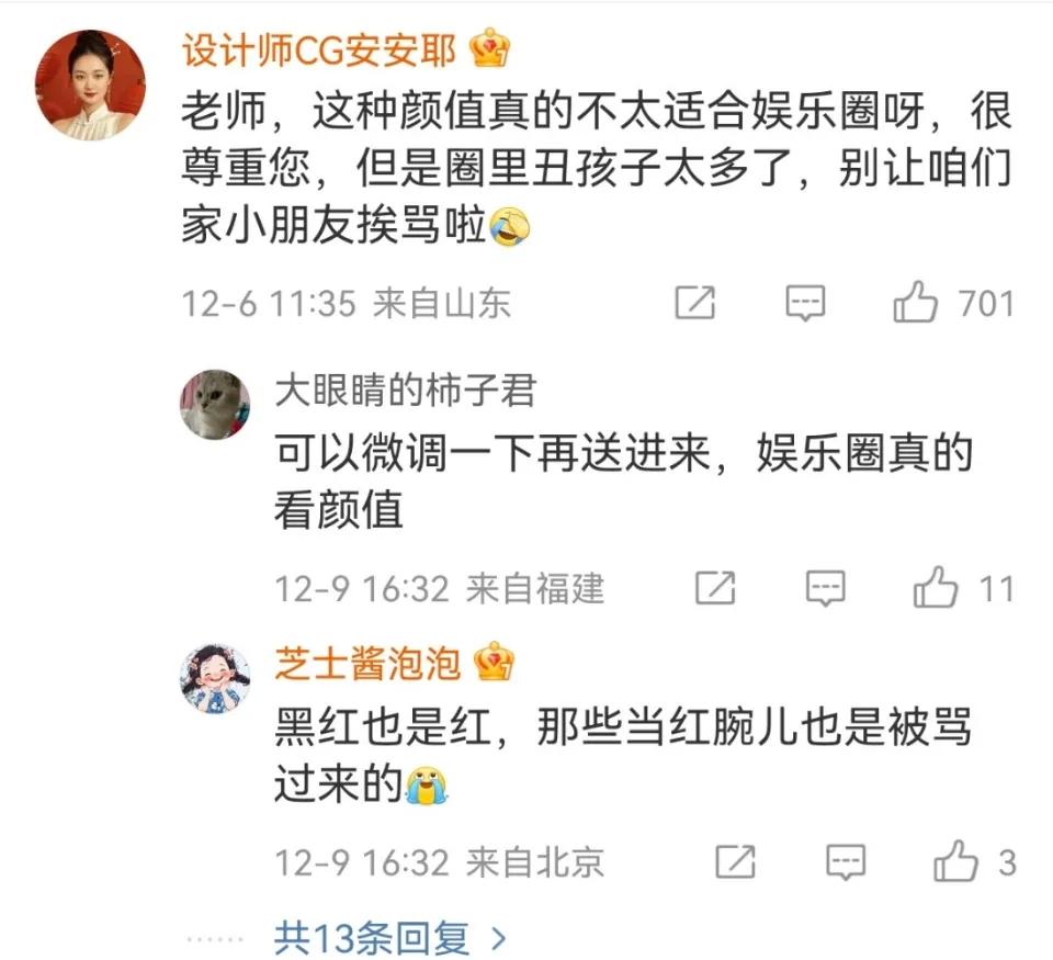 濮存昕外孙女遭大量容貌恶评。 12月5日,72岁的演员濮存昕发文为外孙女宣传助威:“今天外孙女首次参加的荧屏作品《掌上齐眉》开播,虽然只是参与一点点戏份,但是她说很开心。在生活中,她叫韩子萱,是我们家的小天使、暖宝宝!”谁成想,在评论区和相关话题下,不少网友觉得该星三代露脸即“翻.车”,纷纷留言道: 老师,这种颜值不太适合娱乐圈; 一看就是带资进组; 这长相说实话没点背景,海选真的都进不了; 寒门出贵子,在哪个圈看来都很难了; 说不出太难听的话,就是说不要再演了,支持她做些其他事业吧…… 濮存昕解释外孙女只是客串,戏份极少,“是她人生一次美好的记忆”。可是,濮老师就算是再对自家外孙女有滤镜,也不会看不出女孩子这个容貌当演员是不合适的吧。 如果没有“关系”,这孩子顶多只能演个路人甲乙丙丁,怎么可能有这么多特写镜头?网友这说的也是实话啊.....大家看短剧就是为了看帅哥美女的,都已经忽略剧情了[捂脸]就别伤害观众眼睛了。家里有钱优势,何必硬挤进娱乐圈,被人骂两句怕你又受不了。
