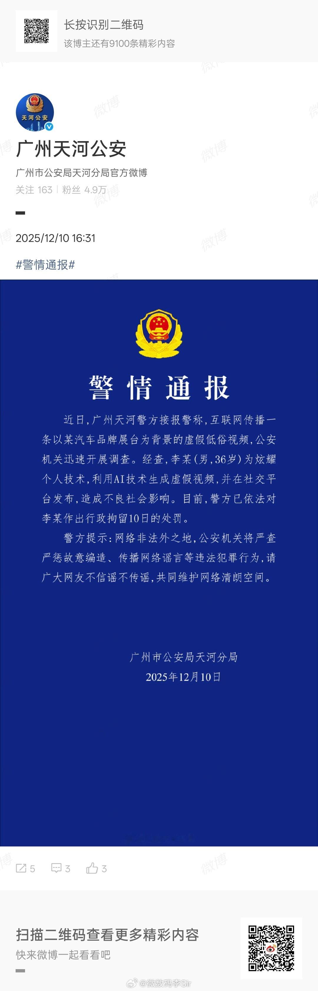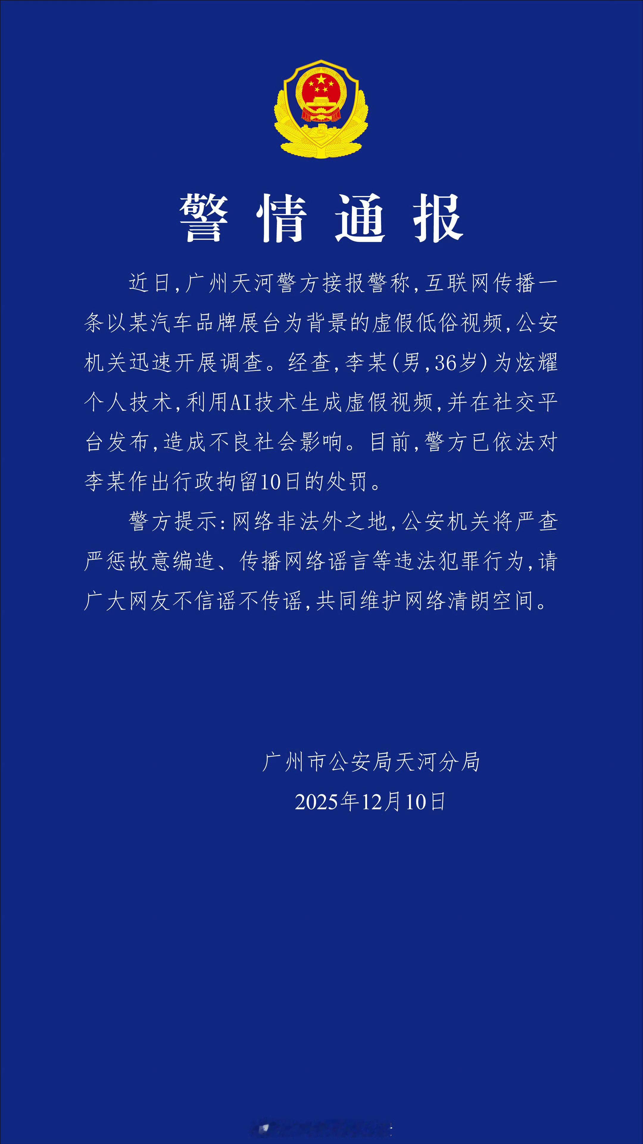 广州车展AI视频造假者被警方抓获广州车展期间,小鹏汽车就有人利用AI技术生成虚假视频向公安机关报案。12月10日,小鹏汽车法务部官方微博发布声明,该案件现已侦破,涉案男子李某被公安机关处以治安拘留10日的处罚!近年来警方查处的多起造谣案件当中,借助AI技术编造并恶意传播虚假内容,扰乱公共秩序的行为屡见不鲜,这些虚假信息造谣成本低,传播速度快、范围广,给企业机构和个人都造成了极其的恶劣影响;相关部门正在通过权威信息发布、跨部门联动执法等举措依法惩治AI制假行为,让造谣传谣者承担相应的法律责任。小鹏汽车法务部表示,将通过法律途径严肃追责,共同营造风清气正、守法有序的网络环境!小鹏展台AI视频造假者已被拘留