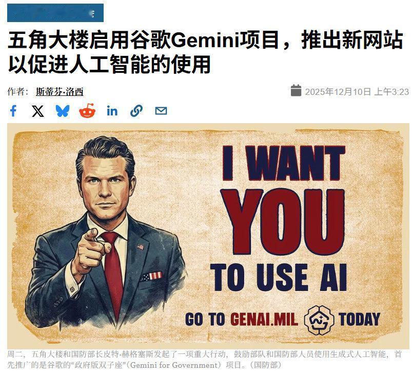 五角大楼最近在人工智能应用上,迈出了一大步。 美国战争部长皮特·赫格塞斯在12月10日正式宣布,推出一个名为“GenAI.mil”的新网站和平台。这个平台首先引入的人工智能工具,是谷歌专门为政府设计的“Gemini”模型。 赫格塞斯对此非常高调。他在一段宣传视频里说:“美国战争的未来已经到来,它的拼写方式就是AI。” 他把这个平台形容为,将“世界上最强大的前沿AI模型直接交到每一名美国战士手中”。他强调,在对手技术快速进步的背景下,军方不能再袖手旁观。 据他介绍,士兵和文职人员只需点击按钮,就能用这个AI工具进行深度研究、文档排版,甚至分析视频和图像,速度是前所未有的。这个计划源自特朗普总统今年七月的一项行政命令,目标是要实现“前所未有的人工智能技术优势”。 更关键的是,五角大楼希望这个系统能够实现“智能代理式工作流”。简单说,就是让AI在极少人工干预的情况下,自主编程、做出决策并采取行动。这被认为能极大提升情报分析、后勤保障和数据收集等领域的效率。战争部的表态充满竞争意味,他们说:“在全球AI主导权的竞争中,第二名没有任何奖赏。人工智能是美国的下一个‘昭昭天命’,我们要确保主宰这个新前沿。” 为了推广使用,五角大楼表示将为所有员工提供免费培训,并强调平台安全性,所有工具都按“受控非机密信息”的高标准来管理。 但这件事也伴随着巨大争议。很多人立刻联想到,谷歌公司过去在军事AI项目上的摇摆态度。2018年,谷歌曾因参与军方的无人机项目,引发数千名员工联名抗议,最终被迫退出并承诺“永不开发战争AI”。如今与五角大楼的深度合作,被舆论批评为对初心的彻底背叛。 此外,五角大楼将AI竞争上升到“昭昭天命”这种带有殖民扩张色彩的口号,也引发了不少担忧。这种将技术竞赛与“爱国使命”强硬捆绑的叙事,让外界感到不安。 更深的忧虑在于伦理层面。当AI开始直接参与到作战决策链条中,比如优化打击方案,谁来为它的判断负责?这引发了广泛的道德讨论。有批评者对比了二战时期美国战争部长对核技术的反思,认为现在的五角大楼似乎将技术伦理视为一种“软弱”。 与此同时,五角大楼在其他与AI相关的军事项目上也在加速。例如,他们正在推进一个大规模的廉价无人机采购计划,目标是到2028年形成规模化的集群战力。他们还与其他AI公司签订了巨额合同,开发能自主执行任务的“代理型AI”。未来的战争形态,可能会演变为AI系统之间的直接对抗。 颇具讽刺意味的是,高调推动AI安全的战争部长赫格塞斯本人,近期却深陷“信号门”丑闻。国防部监察长的报告认定,他曾使用个人加密通讯软件泄露军事行动细节,严重违反了安全规程。这与他强调AI平台安全性的公开姿态,形成了鲜明反差。 总而言之,五角大楼启用谷歌AI平台,标志着生成式人工智能正以前所未有的速度,被整合进美军的日常运作和未来作战构想中。它既是技术竞争的必然步骤,也裹挟着企业伦理背叛的指责、地缘政治的强硬叙事以及深刻的道德风险。这场竞赛已经鸣枪,但其走向和后果,恐怕远比一次简单的平台上线要复杂得多。