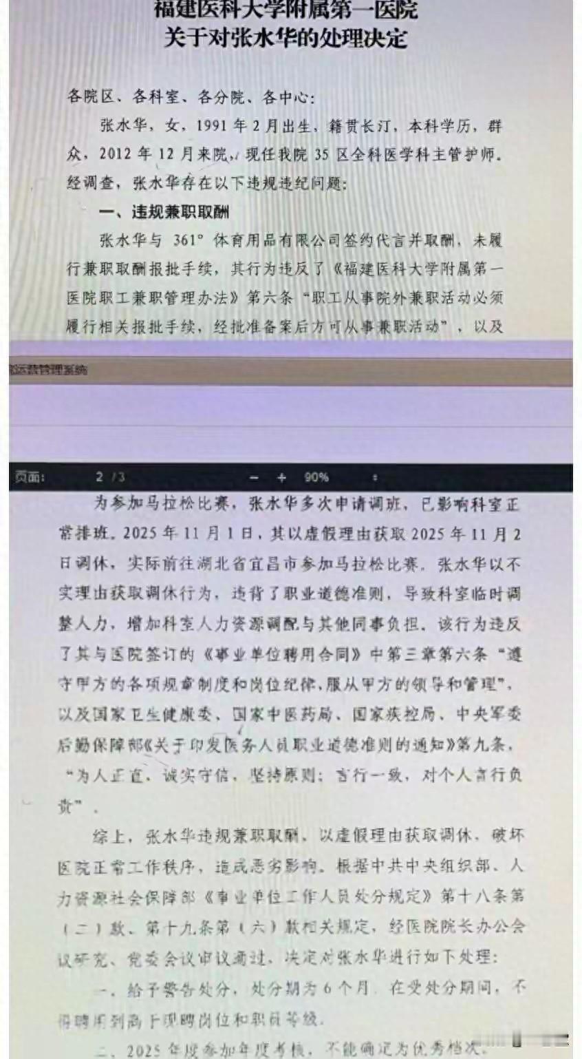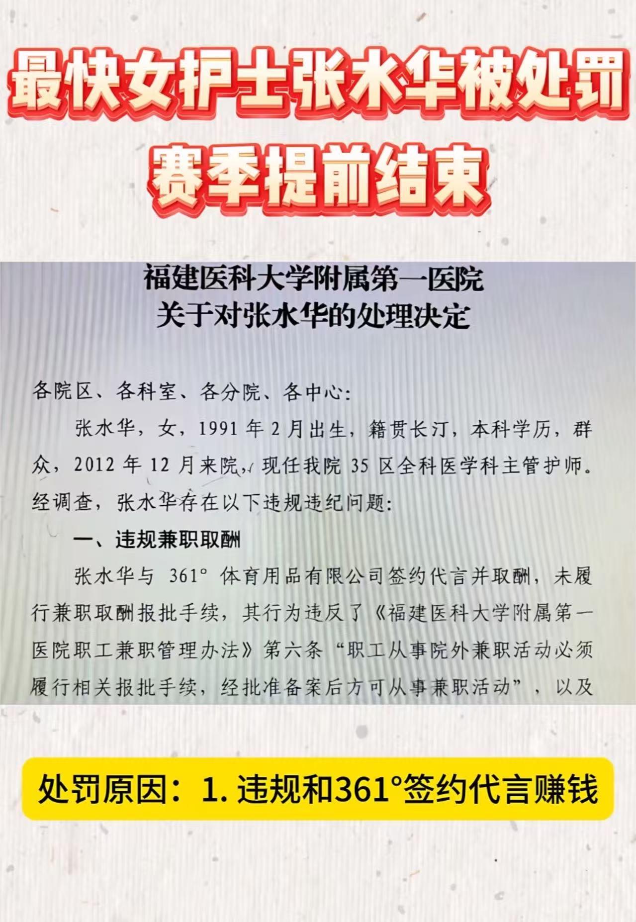最快女护士”张水华被医院警告处分!医院:“存在违规兼职取酬、以虚假理由获得调休行为!”网友炸锅,有网友指责说:“一个员工能取得这样的体育成绩,是业余选手当中的翘楚,作为单位,应该胸怀宽广适度的给予支持才对,至少不应该这样打压!” 张水华是福建医科大学附属第一医院的护士,之前因为跑马拉松跑得又快又好,“最快女护士”的头衔让她圈了不少粉,大家都觉得她又能做好本职工作,又能在业余时间闯出成绩,特别了不起。 可谁能想到,2025年底的时候,医院一纸处分通报下来,说她“存在违规兼职取酬、以虚假理由获得调休行为”,不仅给了警告处分,还设了六个月的考察期,考察期内不能晋升,2025年度的评优资格也直接取消了,等于职业生涯暂时进入了“冷冻期”。 这处分一出来,网友立马炸了锅,两边的声音吵得不可开交。其中不少网友替张水华抱不平,直言指责医院:“人家一个护士,能在业余时间跑出这么好的成绩,在业余选手里那都是翘楚,算是给单位长脸了吧? 作为用人单位,本该胸怀宽广点,适度给点支持才对,就算不支持,也不该这么直接处分打压啊!”在这部分网友看来,张水华的才华和汗水不该被忽视,不就是兼职赚点外快、用别的理由调了个休吗?没必要上纲上线,这么处分反而显得单位太小气,容不下有特长的员工。 可咱要是把事儿掰开了揉碎了说,这事儿真不是“才华该不该被尊重”那么简单。关键问题就出在“违规”和“虚假”这两个词上。就说调休那事儿,2025年11月1日那天,科室排班表上写的是张水华调休,同事们都以为她是累了要休息,或者家里有急事,没人多想。可实际上,她压根没在家,而是跑到了湖北宜昌参加马拉松比赛。 更重要的是,她这趟跑马不是单纯的个人爱好,而是签了361°体育用品有限公司的代言协议,还拿了相应的报酬,这就属于兼职取酬了。 按说现在职场上不少人都搞副业,兼职本身不是啥大错,但错就错在程序不对。 她既没跟医院报备,也没走正规的兼职审批流程,反而用虚假的理由骗了调休。这就意味着,她为了自己的商业活动,不仅隐瞒了单位,还让不知情的同事替她承担了原本该她做的工作,同事们只能加班加点补她的空位。这事儿换谁身上,心里都得有点不舒服吧?毕竟职场讲究的是诚信和团队协作,你不能为了自己的利益,就透支团队的信任,让别人替你买单。 还有网友说“单位该支持”,可支持也得有前提啊。医院是特殊单位,护士的工作关系到病人的安危,岗位上不能缺人。要是今天张水华能因为跑马编理由调休,明天其他人也找各种借口请假,那病房里的工作谁来做?病人的安全谁来保障?规矩之所以是规矩,就是为了维护集体的秩序,不能因为某个人有才华、有成绩,就搞特殊化。 要是因为她是“最快女护士”,就默许她违规兼职、虚假调休,那对其他守规矩的同事来说,也不公平啊。 当然,咱也不是说张水华的努力不值得肯定。能在业余时间坚持训练,跑出好成绩,成为业余选手中的翘楚,这份毅力确实让人佩服。 但才华和成绩,不能成为“越界”的通行证。你有特长可以,搞兼职也可以,但必须在规则框架内行事,先做好本职工作,再兼顾个人爱好,该报备的报备,该审批的审批,这才是职场人该有的态度。 现在网上的争论还没停,一边是觉得医院打压人才,一边是觉得张水华违规就该受罚。 其实说到底,这事儿的核心不是才华和规矩的对立,而是诚信和底线的问题。不管你有多厉害,不管你拿了多少奖牌,在职场上就得守职场的规矩,做人就得讲诚信。要是为了流量和商业利益,就丢了职业底线,用虚假理由骗假,违规兼职,那就算跑得再快,也迟早会栽跟头。 希望张水华能通过这次处分吸取教训,也希望咱职场人都能引以为戒。才华值得骄傲,但守规矩、讲诚信,才能在职业赛道上跑得更稳、更远。毕竟比起一时的成绩,长久的口碑和踏实的态度,才是最宝贵的财富。 (来源:极目新闻)
