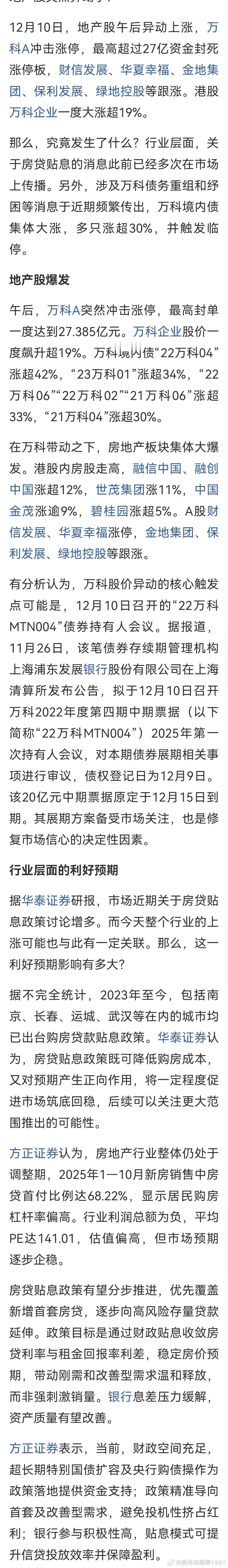12月10日,地产股午后异动上涨,万科A冲击涨停,最高超过27亿资金封死涨停板,财信发展、华夏幸福、金地集团、保利发展、绿地控股等跟涨。港股万科企业一度大涨超19%。那么,究竟发生了什么?行业层面,关于房贷贴息的消息此前已经多次在市场上传播。另外,涉及万科债务重组和纾困等消息于近期频繁传出,万科境内债集体大涨,多只涨超30%,并触发临停。彭博社:据知情人士透露,中金公司再度参与万科纾困,深圳已通过广东省向北京提交纾困方案。这家头部投行正协助深圳市政府及大股东深圳地铁集团,针对万科面临的流动性危机制定综合救助方案。根据最新信息,中金公司主要承担债务重组设计、资产出售协调及融资方案规划等角色,具体措施包括银行贷款展期、优质资产出售、引入政策性资金等。深圳方面已通过广东省向中央提交包含上述方案的报告,但强调此次行动以市场化为主,最终是否实施国资注资尚未明确。房贷贴息
