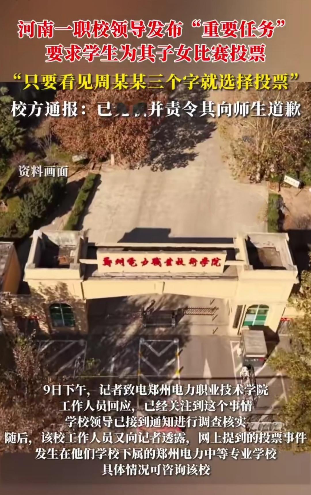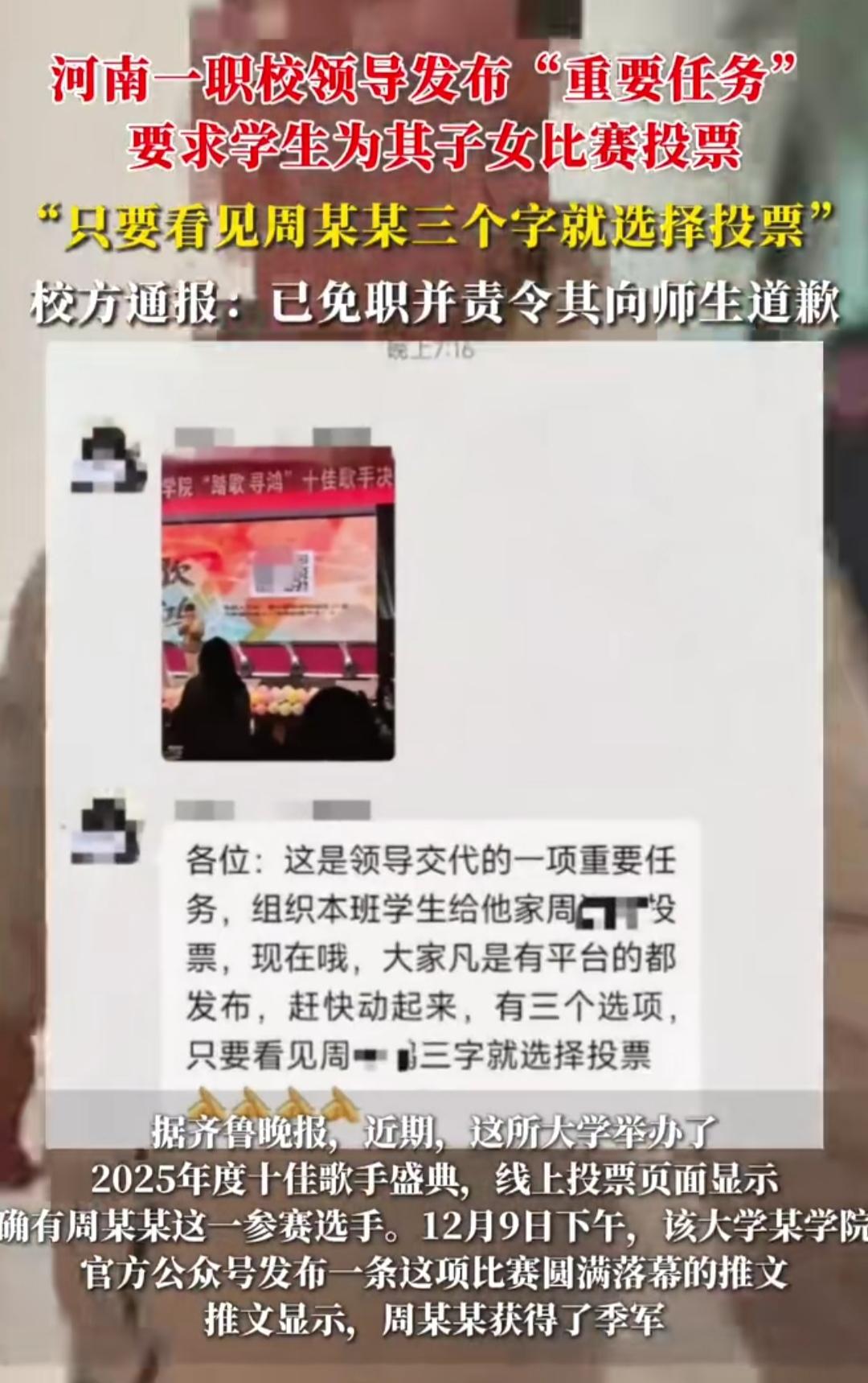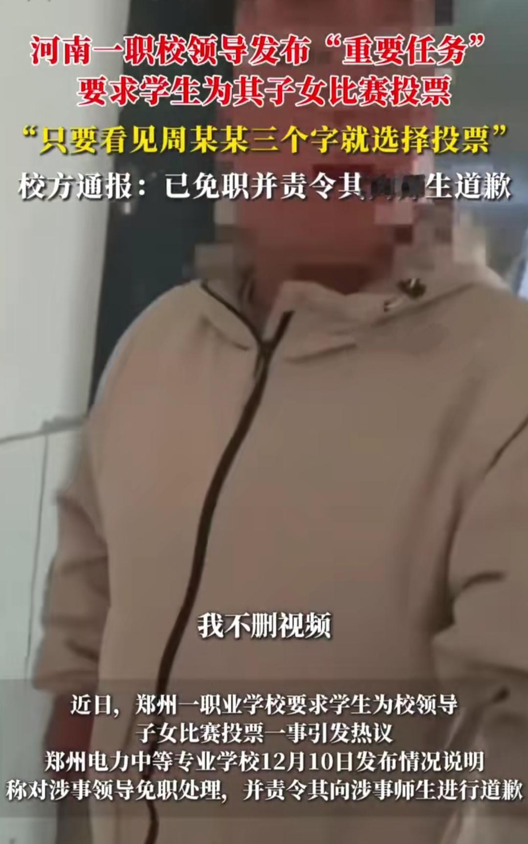 这事儿真是让人哭笑不得,本来一场普普通通的校园歌手比赛,硬是被一位校领导的操作给搞成了“全网热搜”。原本以为只是朋友圈里常见的“熟人拉票”,没想到竟然演变成了一场关于权力边界的严肃讨论。 事情的起因其实很简单,河南郑州电力中等专业学校的领导周某,为了让自己在浙江上大学的儿子在歌手大赛里拿个好名次,动用了自己的“人脉资源”。他直接安排自己学校的班主任,要求学生们为他儿子投票,甚至还要求截图反馈,搞得跟完成作业一样。 这一波“神操作”直接把学生们给整不会了,有人把截图发到网上后,瞬间引发了热议。校方反应倒也迅速,连夜发布通报,核实后直接对周某进行了免职处理,还责令他向师生道歉。 虽然周某的行为确实触犯了红线,但换个角度想,这也算是给咱们现在的“网络投票文化”泼了一盆冷水。现在不管是学校还是单位,隔三差五就得为各种“最美”、“十佳”投票,大家早就烦不胜烦了。这次事件正好让大家重新审视一下,这些靠“刷票”堆出来的荣誉,到底还有没有含金量。 对于这种为了孩子前途“用力过猛”的家长行为,大家觉得是应该理解其爱子心切,还是必须严惩以儆效尤?