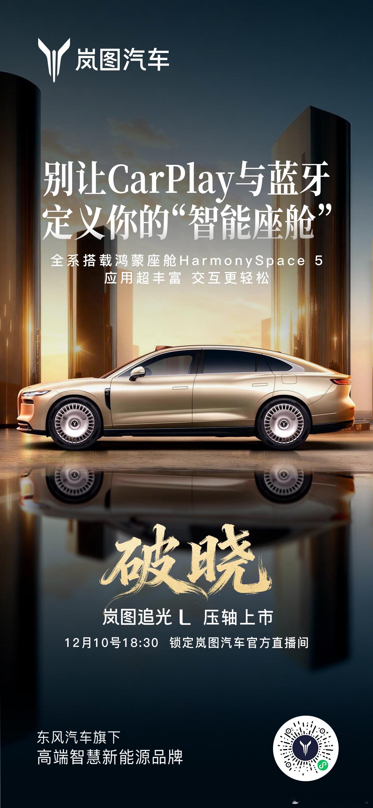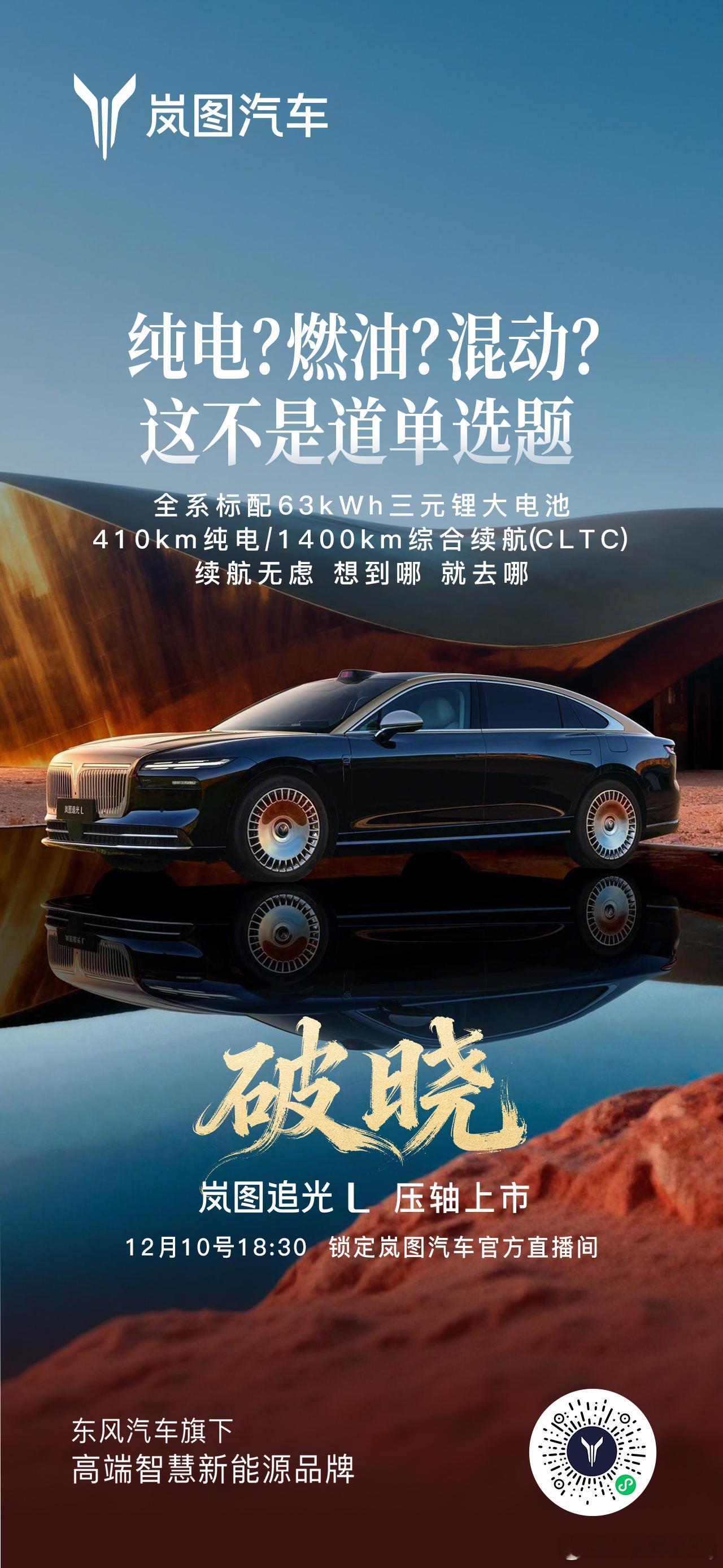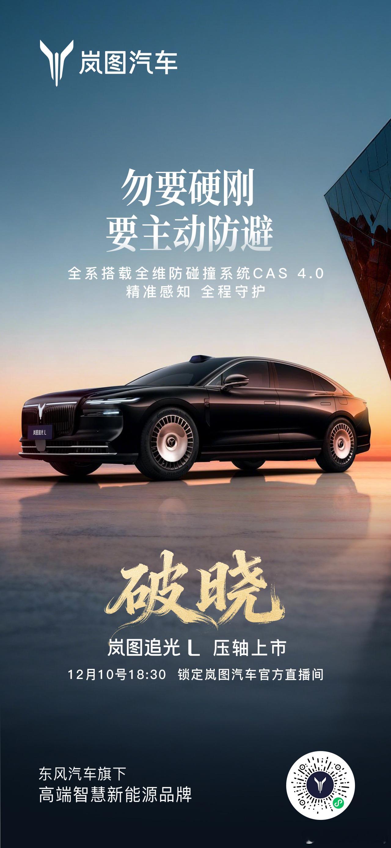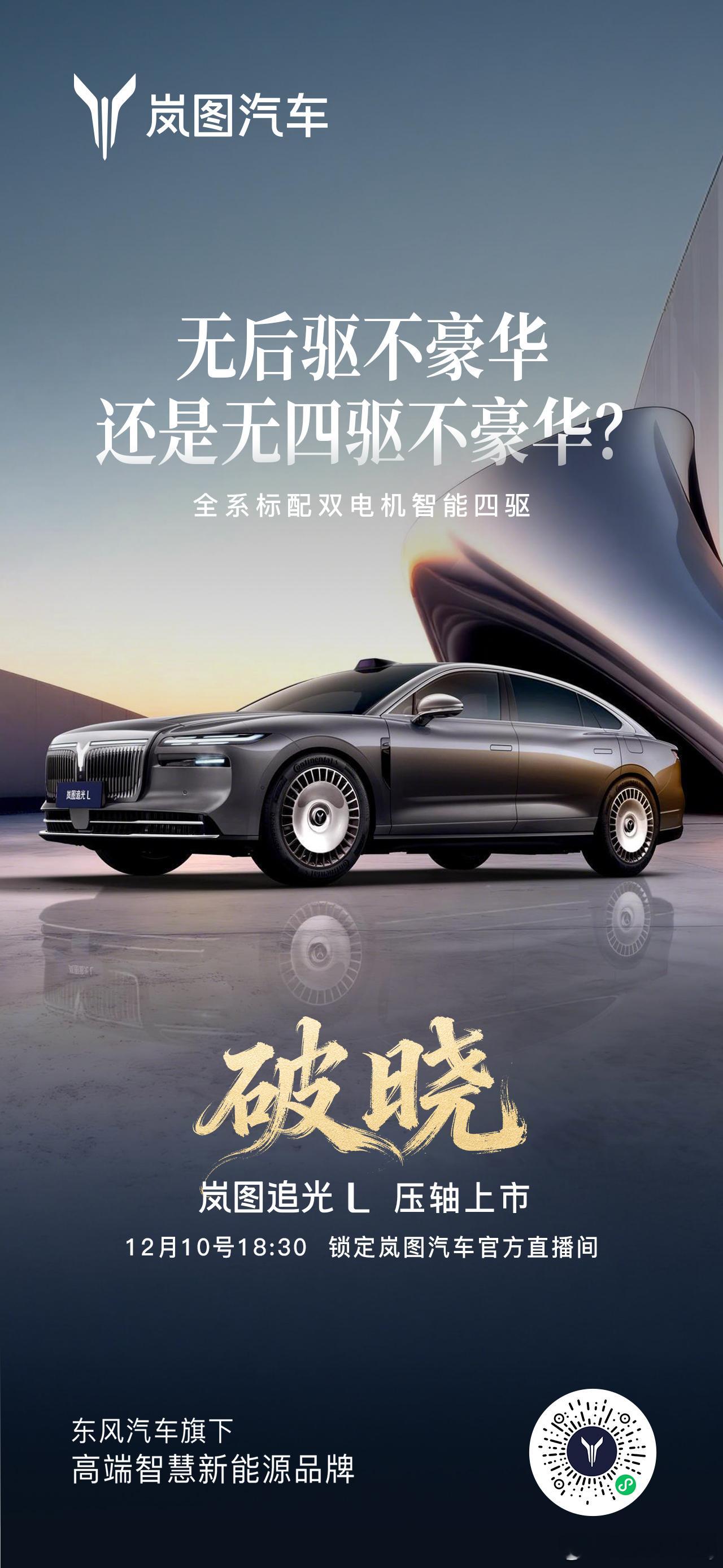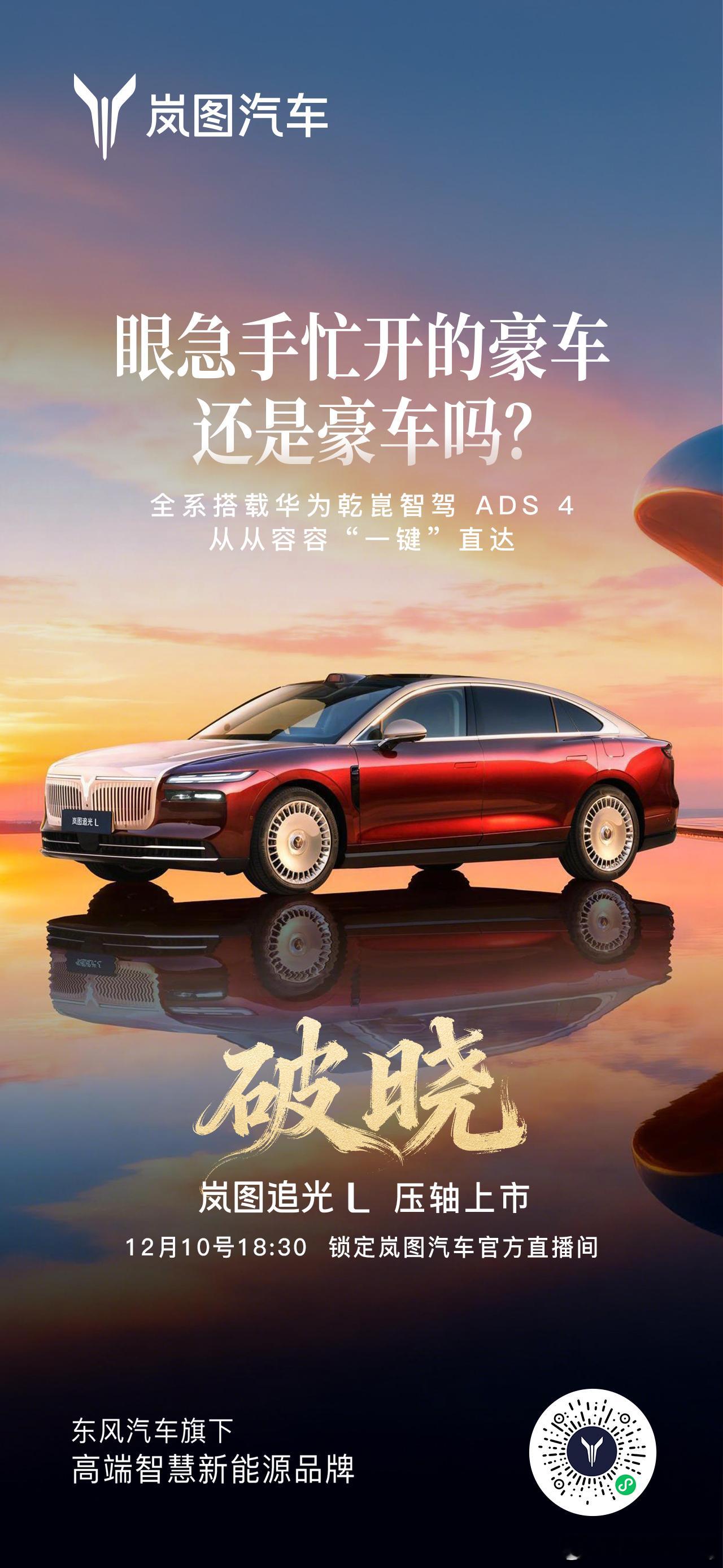 他来了他来了,真豪华跟着来了!就在今晚6:30,岚图追光L压轴登场,闪耀全场!63度大电池、纯电410km、综合续航1400km,一次满足;华为乾崑智驾ADS 4.0与鸿蒙座舱HarmonySpace 5.0双双上车;全系双电机四驱、CAS 4.0全维防碰撞护驾、智能魔毯底盘提前预判路况——配置全维拉满!发布会还有豪礼狂抢:岚图追光L使用权、华为Mate 80非凡大师、京东E卡、精品好物……直播间持续送,手速要顶住!今晚18:30锁定岚图官方直播间,我们不见不散。别光看,一起来抢!岚图追光L12月10日正式上市人生高光开追光华系首款800V插混旗舰轿车新车上市
