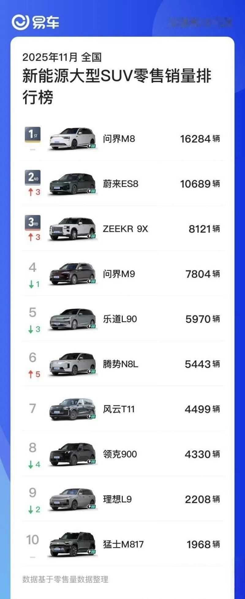 11月各个车企大六座SUV销量,竞争非常激烈。 1,蔚来ES8交付过万,对于一个纯电来说非常难得。 2,极氪9X交付也上来了,11月卖了8121辆,现在终端都是加价提车呢。 3,腾势N8L比腾势N9表现亮眼多了呢[鼓掌] 4,大六座市场竞争也很激进,领克900也下来了,理想L9急需改款,现在销量跌太狠了。 【来自懂车帝车友圈】