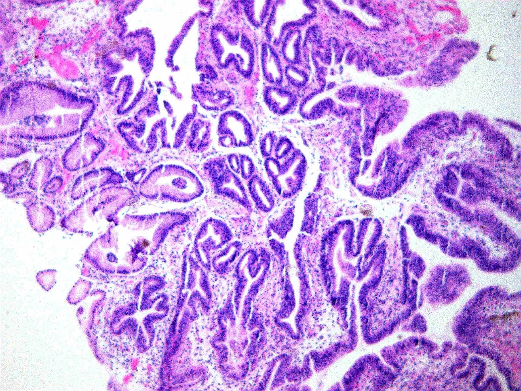 哇哦,树莓哎。小凹上皮肿瘤伴高级别上皮内瘤变,日常工作中并不常见,可惜了,只有一张白光图片~