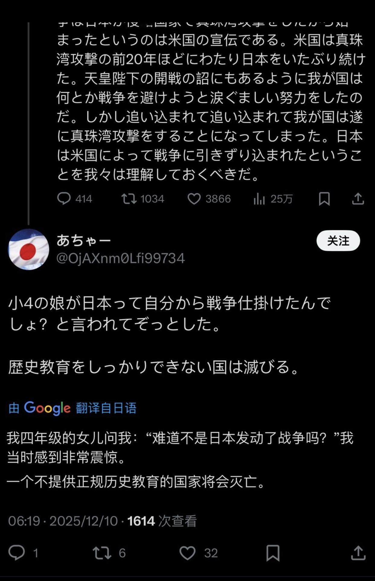 日本航空自卫队前幕僚长田母神俊雄表示:美国一直宣称是日本侵略并偷袭了珍珠港才导致日美战争的爆发,但事实是,在日本偷袭美国珍珠港前,美国就对日本进行了长达20年的骚扰,尽管如此,日本天皇还是在尽量避免战争,然而最终日本被美国逼到了战争边缘,不得不去偷袭珍珠港,日本人必须明白,是美国把日本拖入了战争。 日本网友:我小学四年级的女儿问我“难道不是日本发动了战争吗?我当时感到非常震惊,一个不提供正规历史教育的国家将会灭亡。 日本不就是那个不提供正规历史教育的国家吗?日本一直在美化其对外侵略历史,甚至抹除并否认其战争罪行,这就是某些日本人的无耻之处!