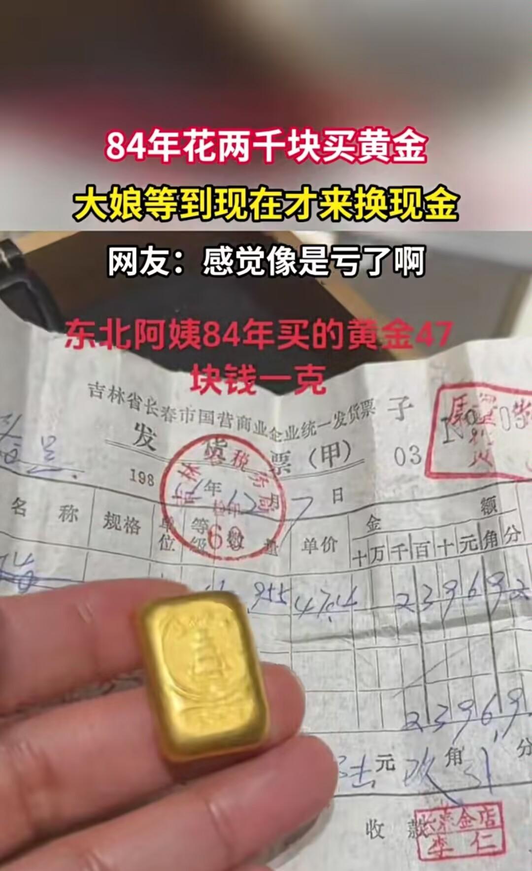 刚刷视频,看到一位东北的阿姨,在1984年咬牙花了2400块钱,买了50克黄金。早知道那会金价一克47块,可普通人那时候一个月才挣30。这笔钱,得不吃不喝还得攒个六七年啦。 放到今天看,相当于谁突然拿出大几十万,全换了金子。你说她图啥?就图个踏实。 现在金价涨了,150克金子大概值15万,差不多是一个普通人三年的工资。数字好像体面了,可那份“重”,一点没轻。当年阿姨用大半辈子的积蓄换一把安稳,今天我们拿三年收入换一条后路,本质上没区别,都是普通人在风浪里,想给自己找块压舱石。 1984年的2400块,要是在农村都能盖起一栋砖房了,今天的15万,在农村想建个像样的房子?连材料带人工都不够。 你看,金子涨了,工资数字也涨了,可钱能换来的“实在东西”,却好像越来越薄。我们跑得气喘吁吁,以为收入翻了百倍千倍,可一回头才发现,能攥在手里的安稳,并没有多出几分。 这不是懒不懒的问题。这是生活的底价,被悄无声息地抬高了。 其实几十年来变的只是账面上的数字,不变的,是普通人那份如履薄冰的心情。阿姨怕孩子没嫁妆,怕老了没依靠,我们怕生病、怕失业、怕一场意外就掏空所有。黄金也好,房子也罢,不过都是承载这份恐惧的容器罢了。 还有所谓的经济发展,有时候只是把同样的艰辛,包装成了不同的数字。过去挣三十块的心慌,和现在挣三万块的心慌,其实性质都一样。所以,你对此事怎么看呢?觉得阿姨会不会亏? 情感