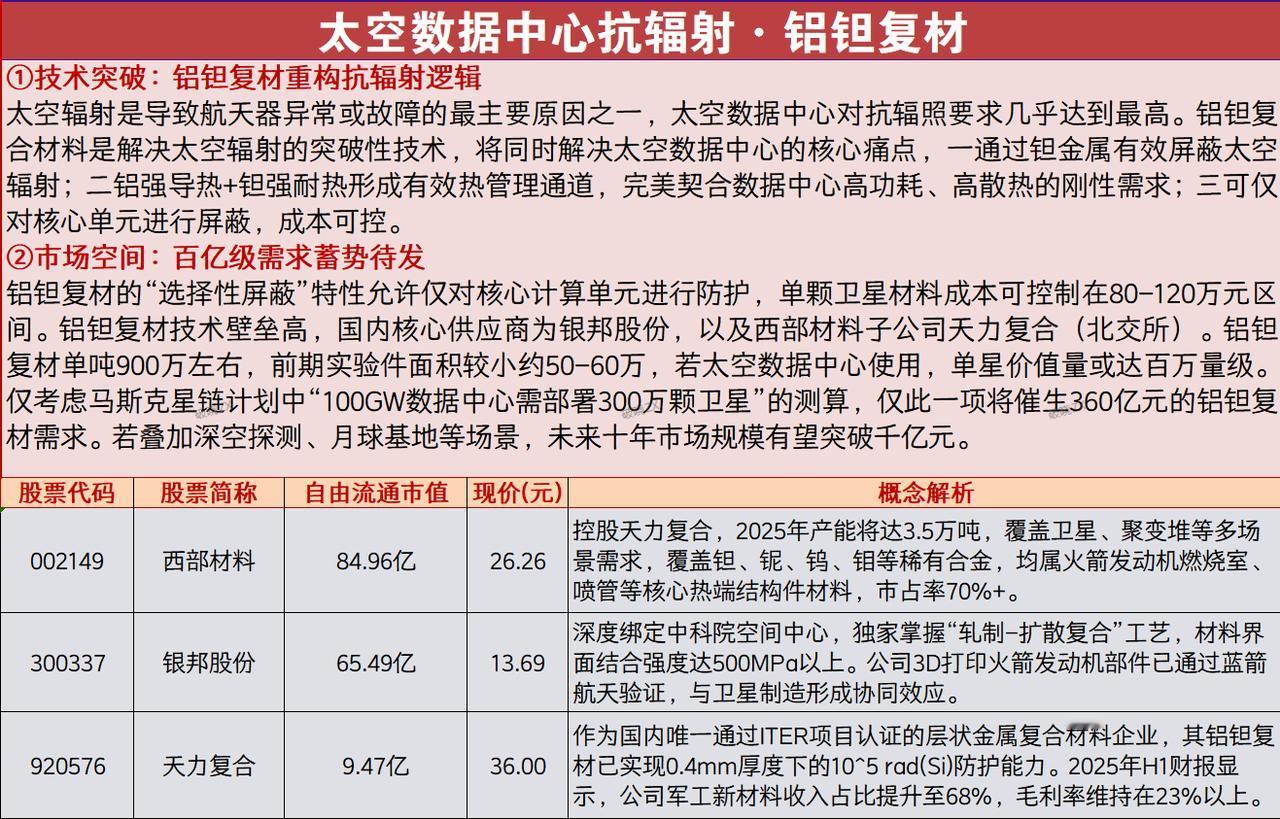 又爆了。之前媒体报道 SpaceX估值8000亿美元,马斯克回应说不准确,搞了半天是嫌媒体报道估值太低了。 在SpaceX的IPO募资计划中,有一项用途被特意提及:开发天基数据中心,包括购买运行所需的芯片。 说白了,就是太空算力! 太空算力老核心: ①顺灏股份:太空数据中心运营商,以1.1亿元战略投资北京轨道辰光科技(持股19.3%),主导"千兆瓦级太空数据中心"建设,"辰光一号"试验星算力达25P,预计2025年底发射。 ②四川金顶:太空算力芯片进度A股第一,子公司开物星空自研"开物神算"系列超算芯片,采用5nm先进制程,峰值算力达12.8PetaFLOPS,已应用于"天算地算"等国家重点项目。 ③乾照光电:航天级砷化镓太阳能电池转换效率达28%,批量供应组网卫星能源系统电池板进度A股第一,为太空算力提供持续能量支持。 太空算力新细分:抗辐射·铝钽复材 ①西部材料:控股天力复合,2025年产能将达3.5万吨,覆盖卫星、聚变堆等多场景需求,覆盖钽、铌、钨、钼等稀有合金,均属火箭发动机燃烧室、喷管等核心热端结构件材料,市占率70%+。 ②银邦股份:20cm,深度绑定中科院空间中心,独家掌握“轧制-扩散复合”工艺,材料界面结合强度达500MPa以上。 SpaceX概念: ①西部材料:公司是SpaceX的“火箭骨骼”顶级供应商,其自主研发的航天级铌合金获得了SpaceX认证,成为国内唯一供应商。 ②再升科技:公司每月稳定向SpaceX出口太空级保温材料,纤维直径最细达0.09微米,全球仅三家能满足该标准,已通过长期认证。 ③应流股份:公司为“猛禽”发动机制造核心熔模铸件,需耐受超过1600℃极端高温,技术门槛顶尖,覆盖NASA及SpaceX一级供应商体系。