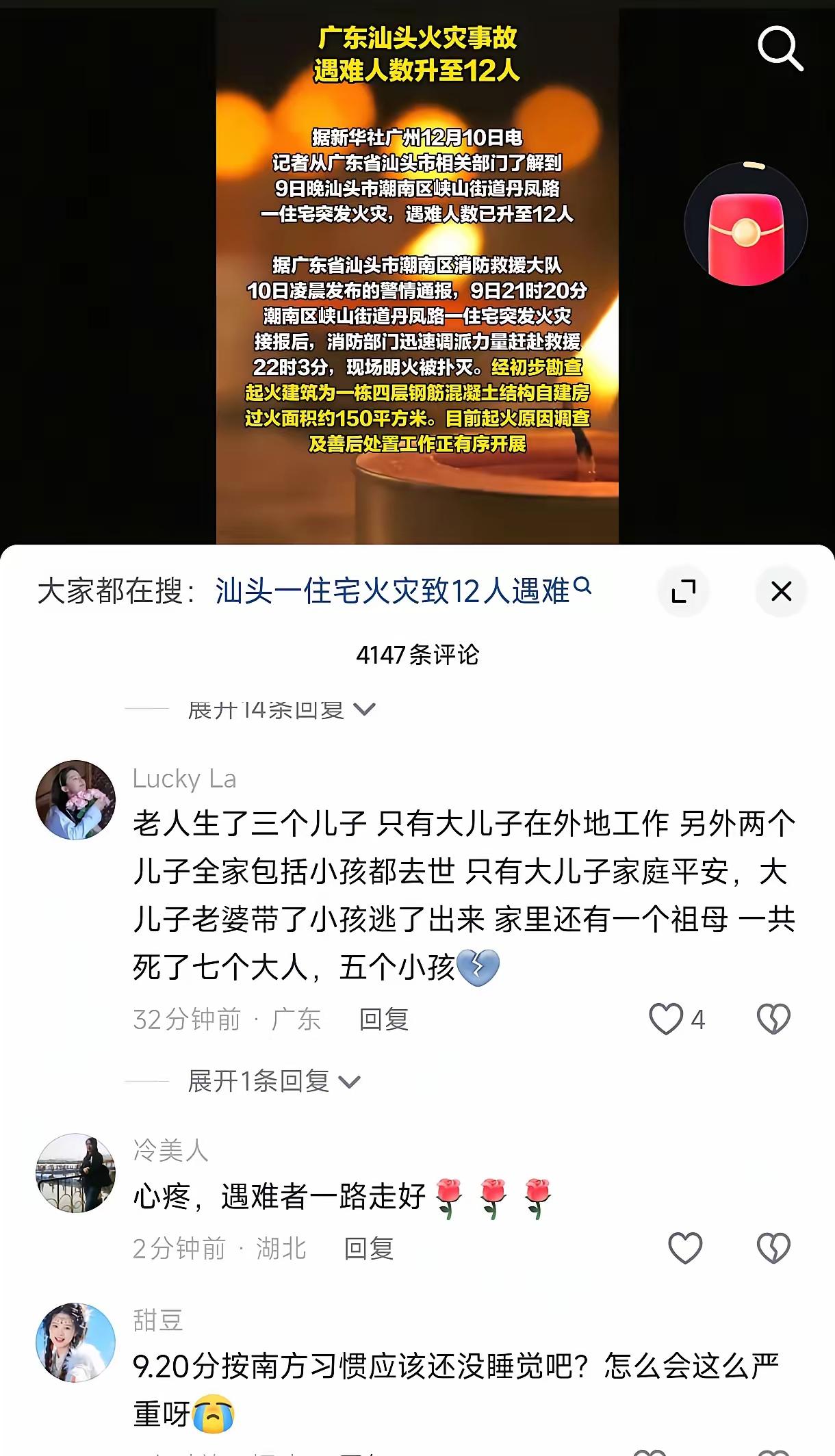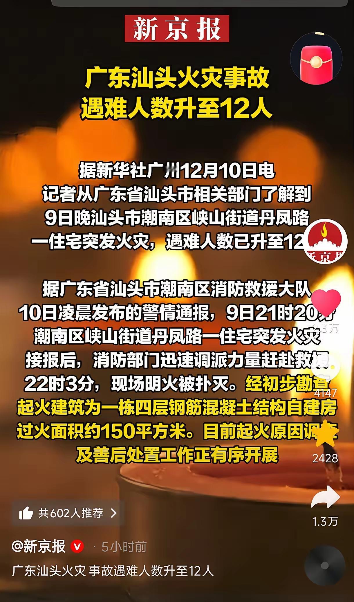 一家四代12口葬身火海,仅6人幸存!这起火灾太痛了! 12月9日晚9点20分,广东汕头一栋四层自建房突发大火。起火的是楼下三间五金机电铺面,短短几分钟,烈焰夹着浓烟如猛兽般吞噬整栋楼——过火面积达150平米,而楼上,正住着一家四代共12口人。 消防员火速赶到,22点03分扑灭明火,但悲剧已无法挽回:8人当场遇难,4人送医后抢救无效离世……一夜之间,12条生命戛然而止,只留下撕心裂肺的悲痛。 据了解,这场火灾夺走了祖母、二儿子一家七口(夫妻+4孩)、三儿子一家五口(夫妻+1孩),唯独大儿子一家因在外打工幸免于难。而当晚在家的大儿媳,在危急关头冷静果断——她给四个孩子戴上湿毛巾,一手抱一个儿子,带着两个女儿成功逃出火场,成为这场灾难中唯一的光。 这一家人在当地口碑极佳,诚信经营、勤劳善良,邻里无不称赞。谁曾想,命运竟如此残酷,好人没换来好报,老天真的“不长眼”? 网友纷纷追问:晚上9点多还没睡,怎么都跑不掉? 我推测:一是火从一楼商铺燃起,堆满电器配件、塑料包装等易燃物,瞬间爆燃;二是住宅与商铺未做物理隔离,毒烟迅速灌满楼梯;三是全封闭防盗窗成了“夺命牢笼”,唯一电梯也被烟火封锁——逃生无门,救援困难。 更令人忧心的是,这种“下店上住”的自建房在全国乡镇极为普遍。我家老家也一样:一层开店,二三四层住人。方便是方便了,可安全隐患触目惊心! 这次惨剧再次敲响警钟: 商住一体必须严格分隔! 防盗窗要设逃生口! 楼道不能堆放杂物! 家庭应急演练不能少! 最幸运的是大儿媳的清醒与勇敢,她用一己之力扛起了四个孩子的未来。她是真正的女英雄! 愿逝者安息,生者坚强。 秋冬干燥,年关将至,请所有人务必重视消防安全!别让悲剧重演! 火灾警示 消防安全 人间悲剧 商住混用隐患