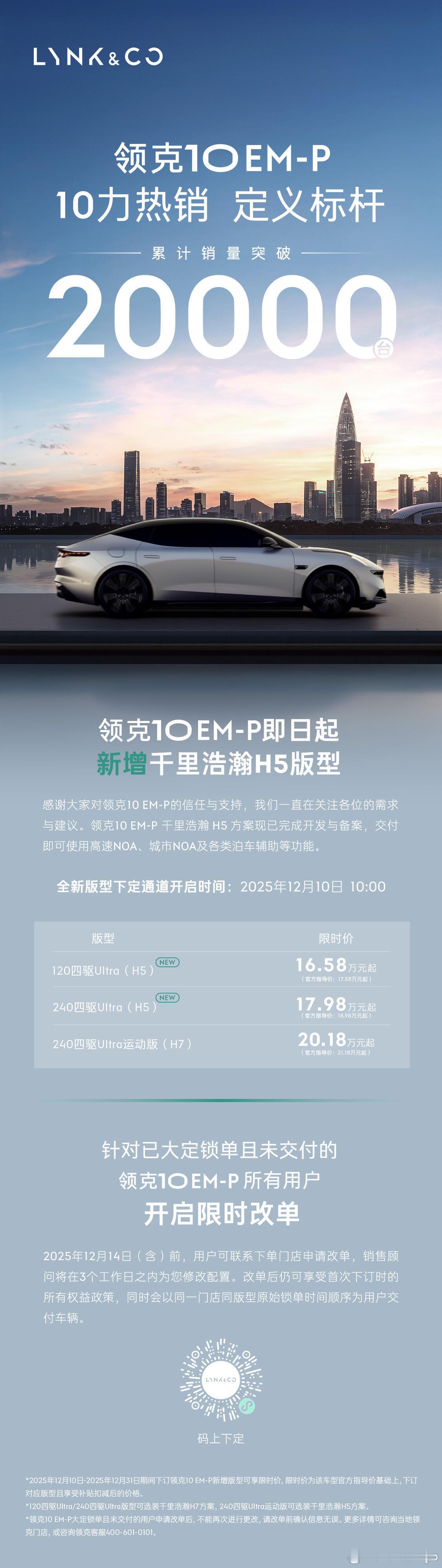 领克10EM-P销量快速突破2万领克10EM一P迅速达成两万台销量,在主流混动市场证明了其爆发力。这不仅是数字,更是市场对其价值定位的直接肯定。销量意味着大规模交付和真实口碑的开始,这比任何宣传都更具说服力。它的快速交付,为品牌在高端混动领域站稳了脚跟。值得留意的是,销量起来后即刻扩展了千里浩瀚H5方案的选装范围,给予用户更灵活的选择。这种快速响应市场的策略,展现了其以用户为导向的务实风格,后续潜力值得关注!领克汽车