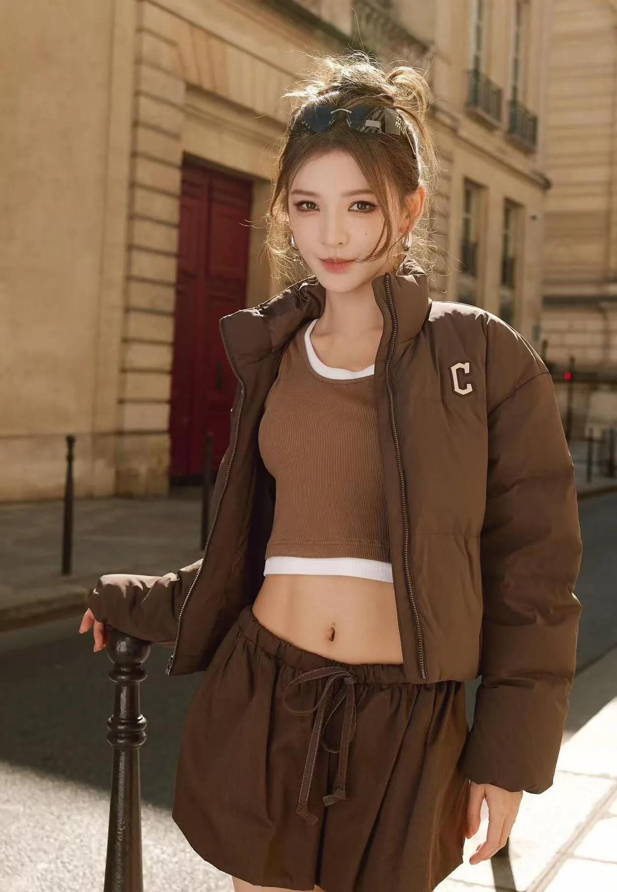 张予曦这组冬日穿搭,把“甜酷松弛感”焊在身上了🍫 焦糖棕短款羽绒服叠穿同色系露腰背心+短裙,白边内搭和浅棕球鞋做点缀,甜酷平衡得刚好! 松松垮垮的丸子头+墨镜发饰,把冬日街头的慵懒时髦劲儿拿捏得死死的,这减龄感谁看了不喊句“姐姐会穿”~