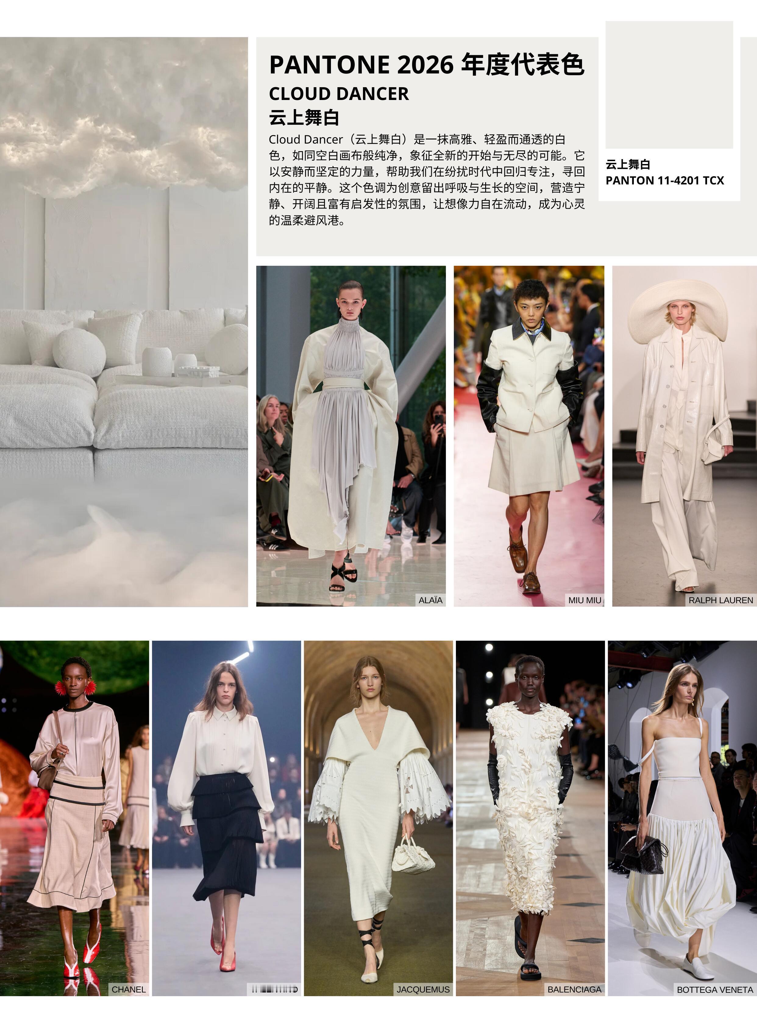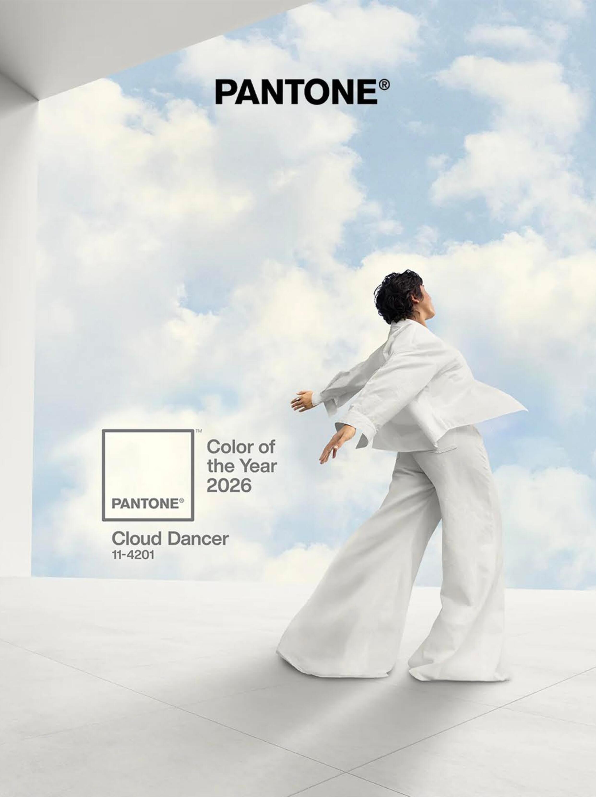 2026年度代表色风格大赏潘通2026年度代表色是“云上舞白”,这抹不冷不暖的柔和白色,不像纯白那样刺眼。它就像清晨带雾的云朵,能帮我们在信息爆炸的喧嚣里“视觉降噪”,找回专注与平静,既百搭又显质感,还象征着重新出发的无限可能。