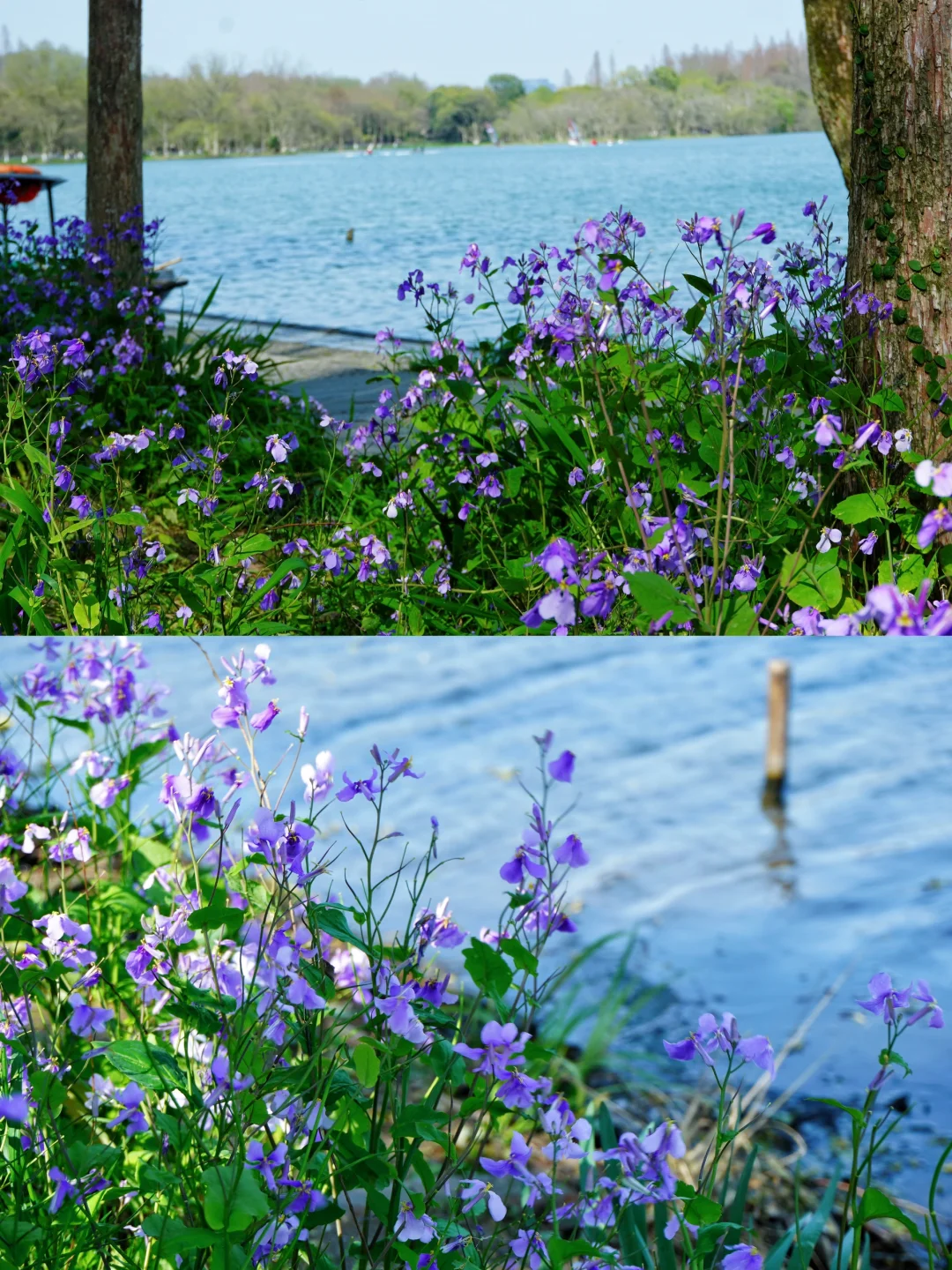 💜二月兰主要在芳桂亭、一镜芳香、黛色参天附近,可以从杨公堤入口进,边走边拍,一路美不胜收。
