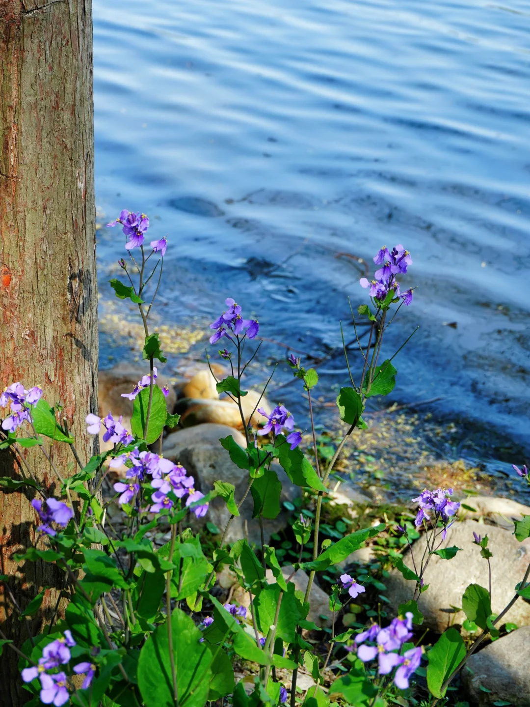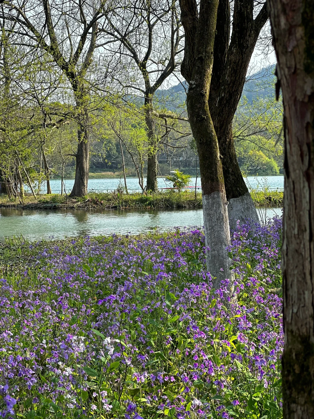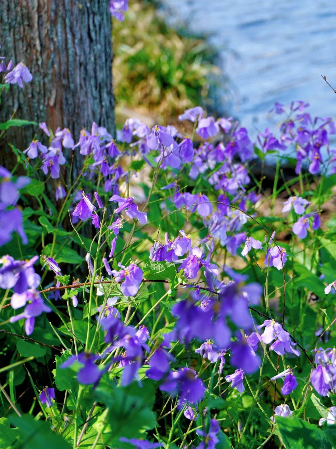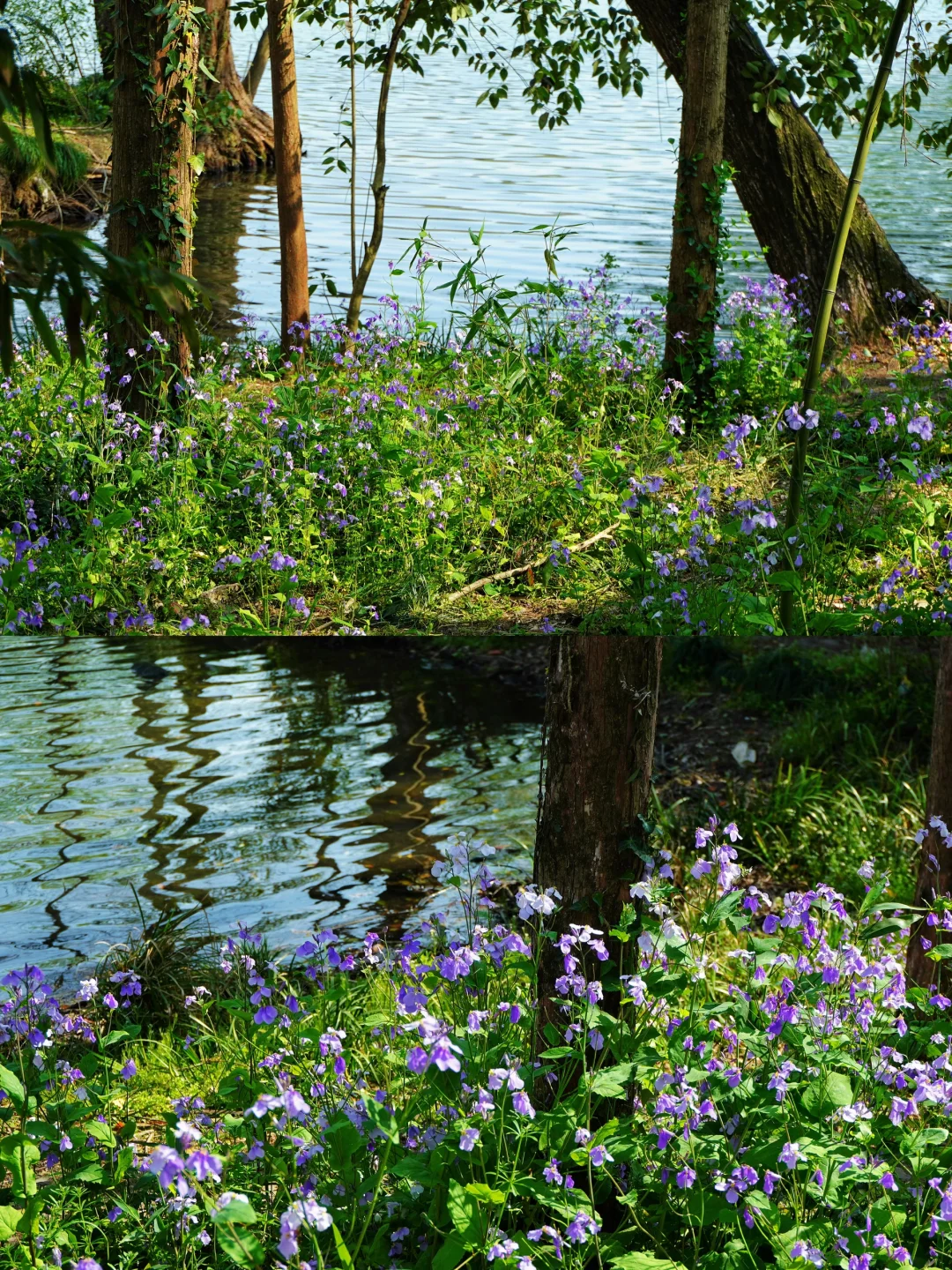 碧绿的湖畔,成片的二月兰