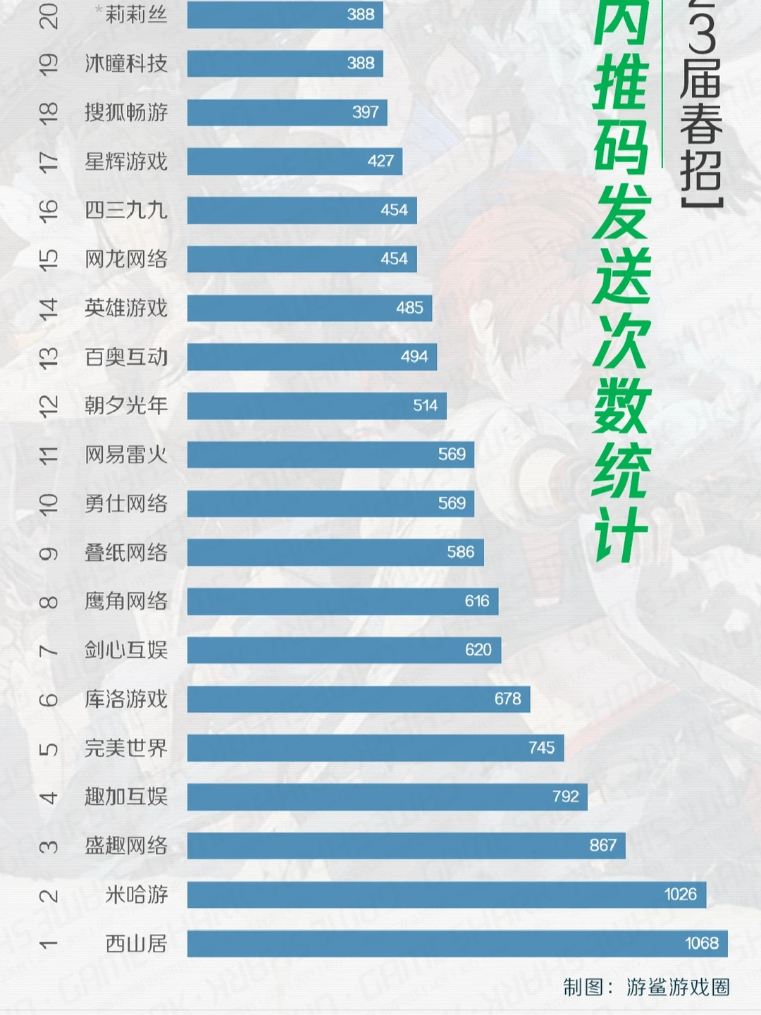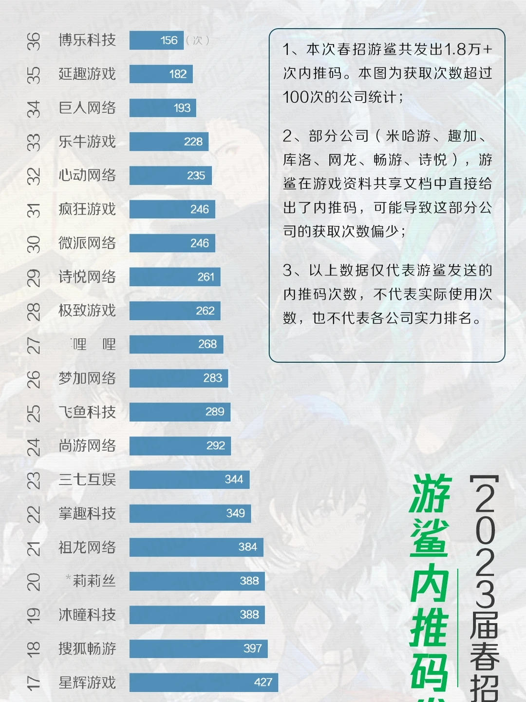 1、本次春招游鲨共发出1.8万+次内推码。本图为获取次数超过100次的公司统计; 2、部分公司(米哈游、趣加、库洛、网龙、畅游、诗悦),游鲨在游戏资料共享文档中直接给出了内推码,可能导致这部分公司的获取次数偏少; 3、以上数据仅代表游鲨发送的内推码次数,不代表实际使用次数,也不代表各公司实力排名。