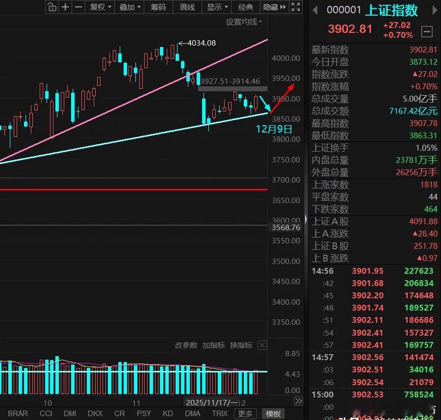 大跌风险解除,短线即将止跌,行情有望延续!今天大盘继续调整,盘中一度4000家下跌,收盘却神奇逆转,强势拉起,行情越来越清晰;近两天的调整已经将短线暴涨的风险释放,根据此前的预测,大盘若在当下位置展开几天震荡;那么未来行情有望持续更久,那么我们此前预计大约是在1月20号左右行情最终到达高潮;预计今天晚间12月美联储一息会议结果即将公布,那么对于A股来说,明天走势很关键;从技术面看,今天尾盘拉升,明天需要一个回调,如果有一个低开将会收出中大阳线;从消息面看,如果今夜美联储宣布降息,明天有可能会高开高走,但短线上方空间不大;总体来看,大盘将继续震荡向上,短线过快上涨,不宜追高,我是金多多看市,我们明天见!上证指数股市日记大盘猜涨跌