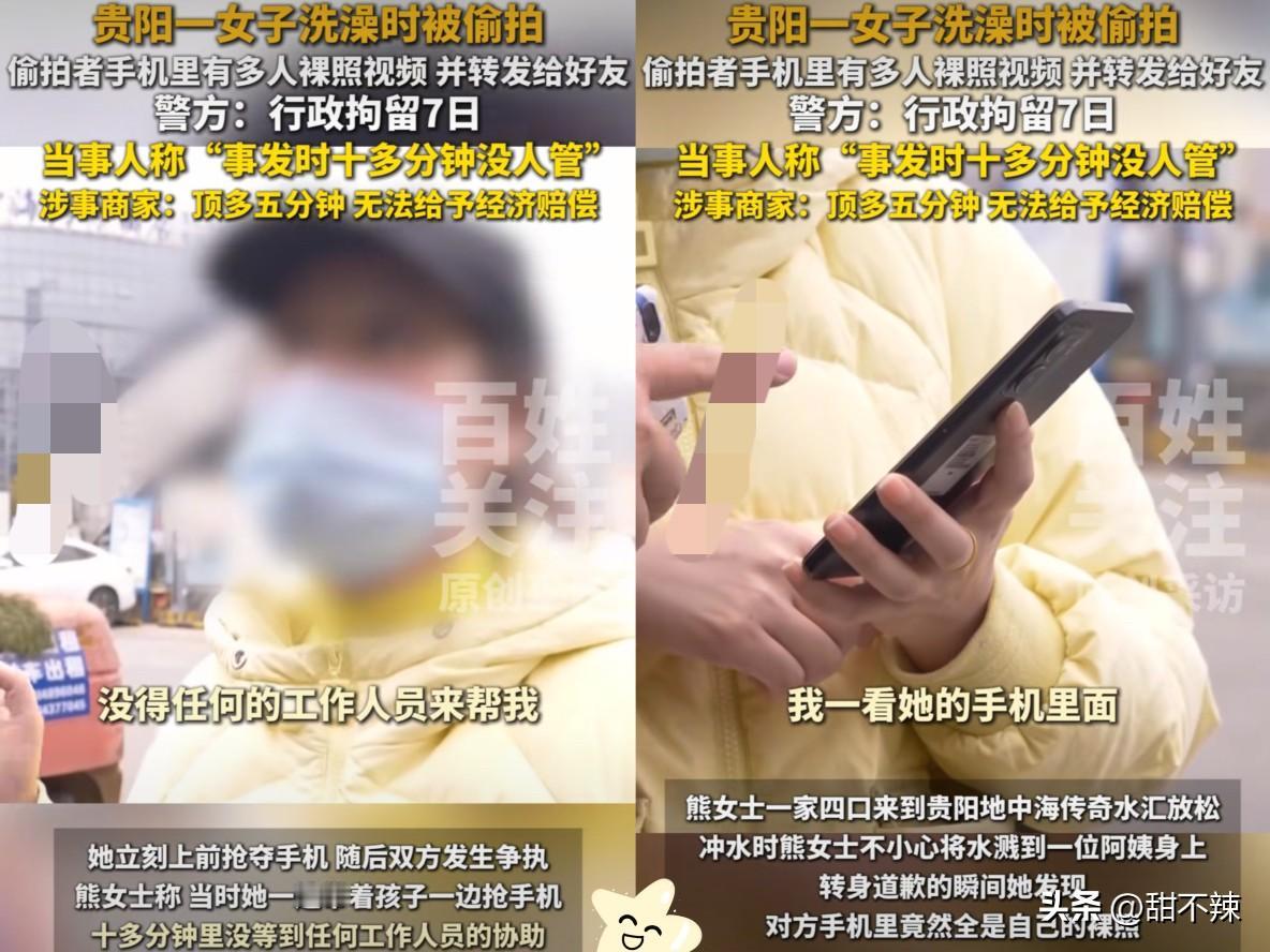 贵州,熊女士去外面洗澡, 竟在淋浴区撞见大妈偷拍隐私照, 更让人寒心的是,她护着孩子和偷拍者拉扯整整十分钟,全程没一个工作人员上前搭把手! 偷拍大妈被拘7天纯属罪有应得,但水汇的操作才叫离谱到家! 法律明确规定,密闭私密的消费场所对顾客的隐私和安全负有更高保障义务,可他们不仅失职旁观冲突! 事后还想用几张免费门票打发人,直接拒绝经济补偿,甚至甩出“法院判多少赔多少”的甩锅言论! 要知道,隐私被侵犯带来的心理伤害,哪是几张门票能抹平的?商家收了钱就该尽到保障责任,这种漠视消费者权益的态度,比偷拍本身更让人膈应! 花钱消费是为了图舒心,不是为了买惊吓、受委屈! 你们对此事怎么看? 女子洗澡时被偷拍 偷拍者已被行拘