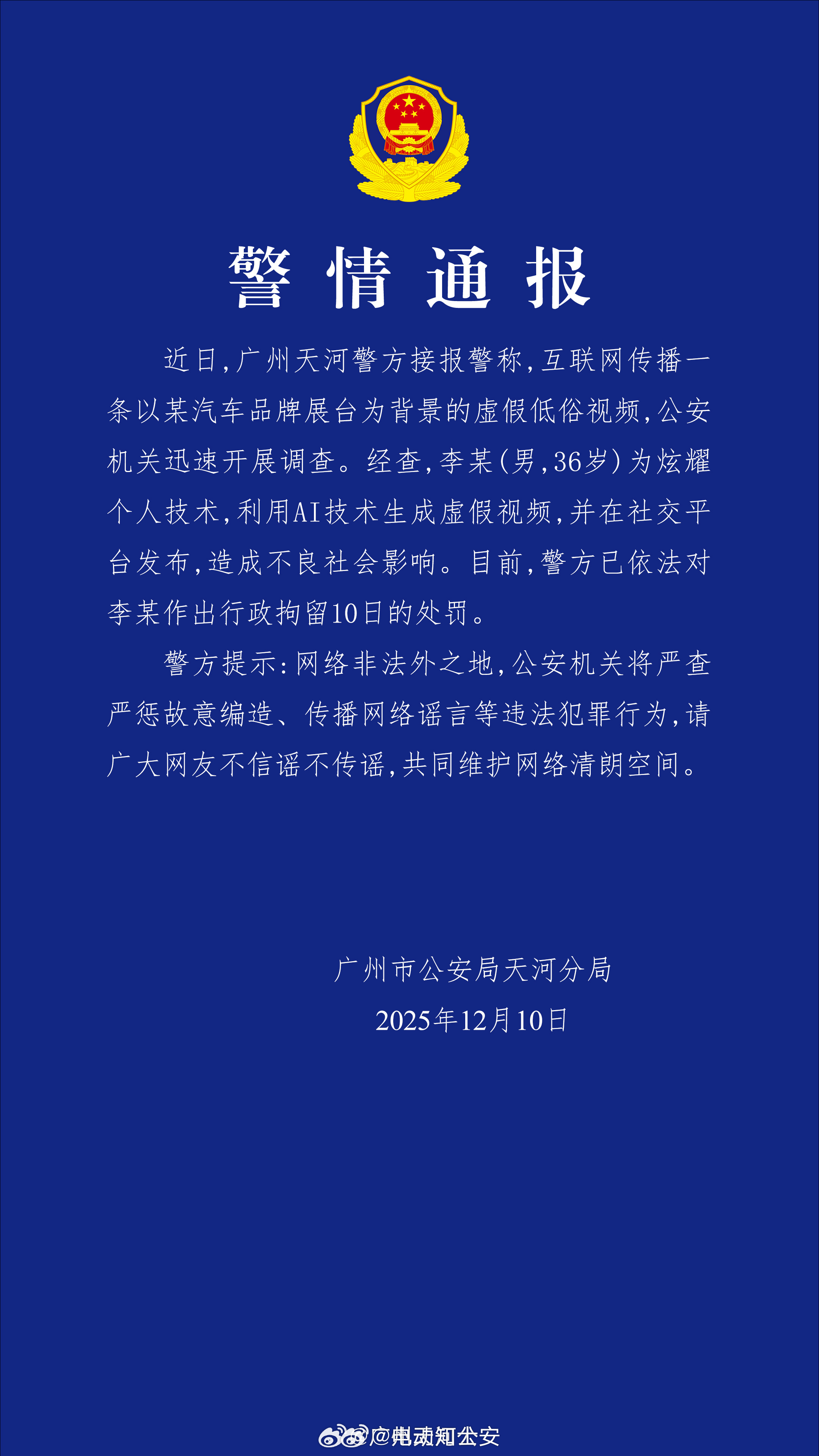 [话筒]利用AI技术生成虚假视频造谣小鹏汽车的案件侦破,涉案男子李某被公安机关处以治安拘留10日的处罚。