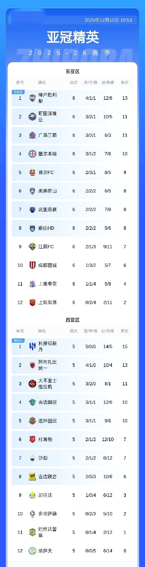 亚冠积分榜:中超3强排倒数后三名,海港积2分垫底基本出局 12月10日 亚冠赛6轮, 上海申花客场0-1不敌广岛三箭 积分榜上:中超3队继续包揽倒数后三名,蓉城积6分第10,申花积4分第11,海港积2分垫底,还剩2轮基本出局。神户积13分领跑