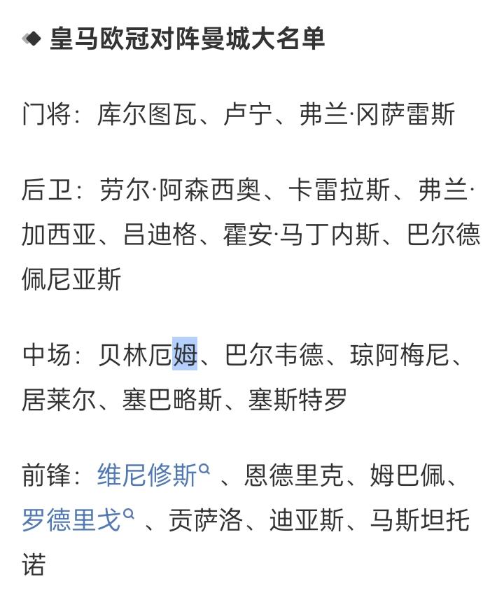 皇马大名单:姆巴佩带伤入选,维尼修斯、贝林厄姆在列,卡马文加缺席,后卫6人 12月10日,明天凌晨欧冠联赛小组赛第6轮,皇马主场迎战曼城,赛前皇马公布本场比赛大名单:维尼修斯、恩德里克、罗德里戈、迪亚斯、马斯坦托诺、贝林厄姆、巴尔韦德、琼阿梅尼、悉数入选 有伤在身的姆巴佩入选大名单,卡马文加缺席,多位小将入选