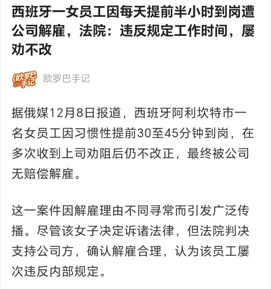 西班牙女员工连续提前到岗被开除: 差点以为是连续提前离岗,我真是服了这才是禁止内卷的最好办法我刚转发到我们公司群,你们猜怎么着了?