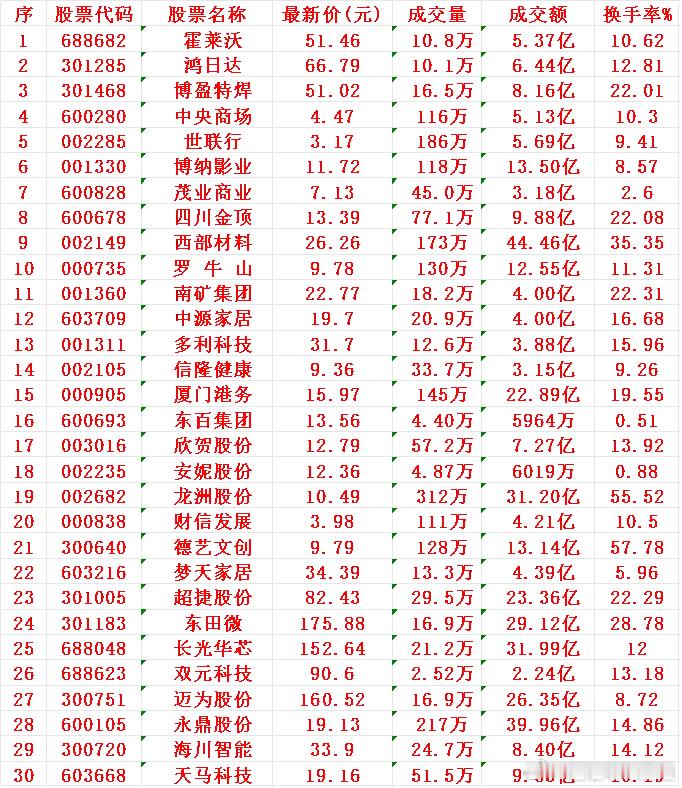 12月10日,均线多头排列的30名单汇总霍莱沃(688682):最新价 51.46元,成交量 10.8万股。鸿日达(301285):最新价 66.79元,成交量 10.1万股。博盈特焊(301468):最新价 51.02元,成交量 16.5万股。中央商场(600280):最新价 4.47元,成交量 116万股。世联行(002285):最新价 3.17元,成交量 186万股。博纳影业(001330):最新价 11.72元,成交量 118万股。
