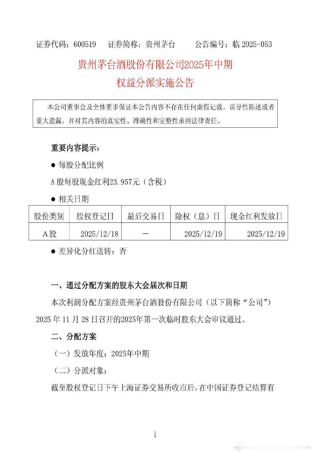 【贵州茅台派发300.01亿现金红利】贵州茅台2025年中期分红 12月10日,贵州茅台(600519.SH)公告称,公司2025年中期利润分配方案已获股东大会通过,将以总股本12.52亿股为基数,每股派发23.957元现金红利(含税),共计派发300.01亿元(含税)。股权登记日为2025年12月18日,除权(息)日和现金红利发放日均为2025年12月19日。部分股东的红利将由公司自行发放。扣税说明根据不同股东类型,分别按10%或20%税率代扣代缴所得税。(财联社)