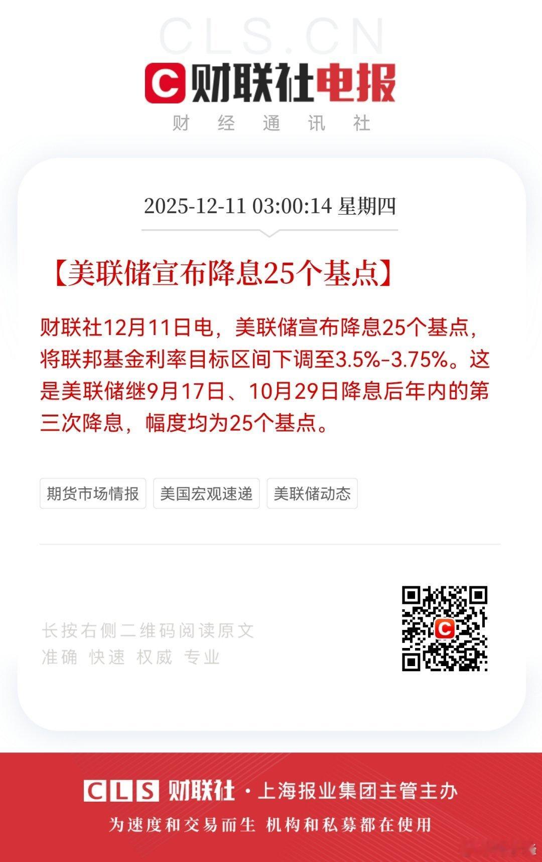 【美联储宣布降息25个基点】财联社12月11日电,美联储宣布降息25个基点,将联邦基金利率目标区间下调至3.5%-3.75%。这是美联储继9月17日、10月29日降息后年内的第三次降息,幅度均为25个基点。